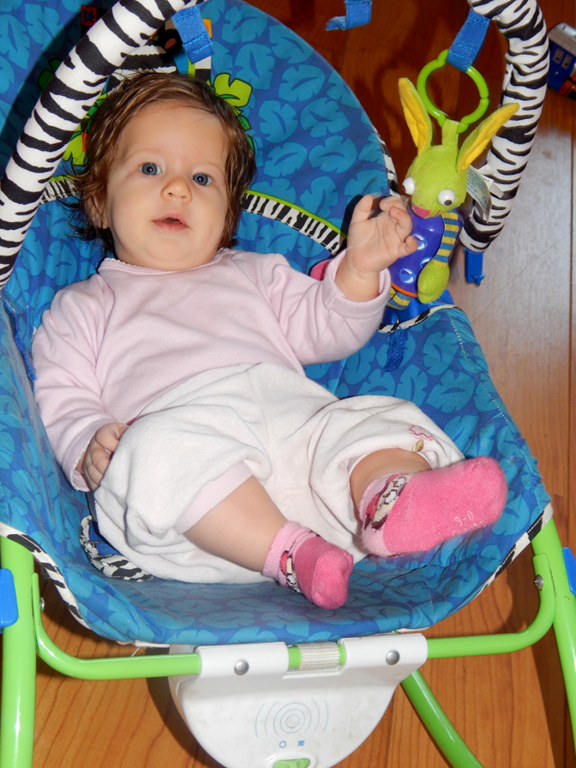 Lubię leżeć w swoim niebieskim bujaczku – leżaczku i chwytać wiszącą przede mną małpkę, pluszowego ananasa lub królika, który pięknie dzwoni, gdy go dotykam. Trącam łapką swych przyjaciół, a potem pac – złapanego wkładam do buzi. Schwytany – posmakowany! A jak posmakuję (czytaj: poślinię) jednego, zabieram się za drugiego. To sympatyczna zabawa, naprawdę sprawia mi ona dużo radości.