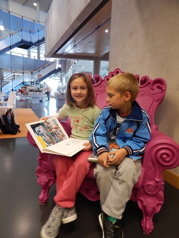Biblioteka wywarła na nas pozytywne wrażenie. Przypominała nam trochę „sklep samoobsługowy”. Czytelnicy przemieszczali się między licznymi regałami w poszukiwaniu interesującej lektury. Niektórzy siedzieli zaczytani na kanapach lub przy stole. Obecność bibliotekarzy była bardzo dyskretna, niemal niewidoczna. Groszek i Iskierka z ochotą „zagubili się” pomiędzy półkami. Było ich tak wiele…Wszystkie posegregowane pod względem wieku małych czytelników i zaawansowania techniki czytania. Niełatwo podjąć decyzję, jakie książki wypożyczyć za pierwszym razem. Taki wielki wybór…