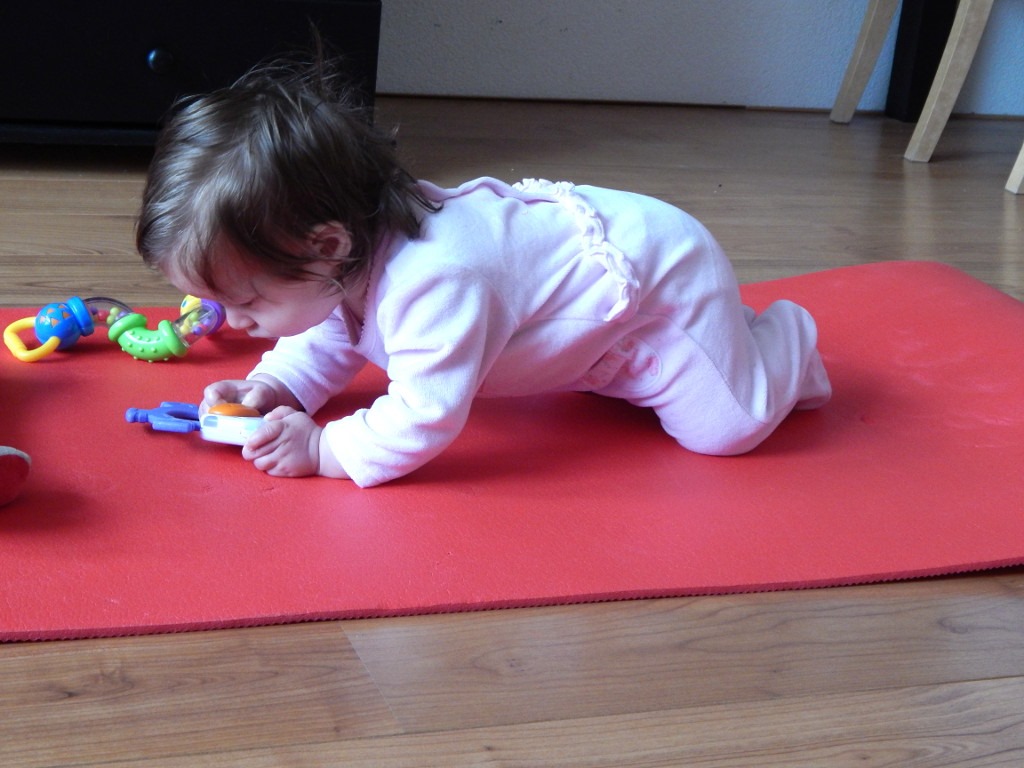 A gdy się budzę, jestem wypoczęta i pełna energii. Wtedy najbardziej lubię leżeć na brzuchu i ćwiczyć. Nauczyłam się nowej sztuczki! Z pozycji na brzuchu, unoszę łokcie i kolana. Przyjmuję pozycję „na czworakach” i bujam się na rękach. Gdy wykonuję to ćwiczenie na macie oraz w łóżeczku, rodzice i babcia przypatrują mi się z wielkim zdumieniem i zachwytem. Mówią, że jestem silna oraz że mam mocne ręce i brzuch. A skoro starsi tak twierdzą, to pewnie jest to prawda. Zauważyłam, że dzięki temu kołysaniu, mogę sama zmienić kierunek położenia swego ciała i odwrócić się w stronę ulubionej zabawki, bez proszenia o to kogokolwiek. Babcia przywiozła mi piękną, szeleszczącą biedronkę w prezencie od rodziców chrzestnych.