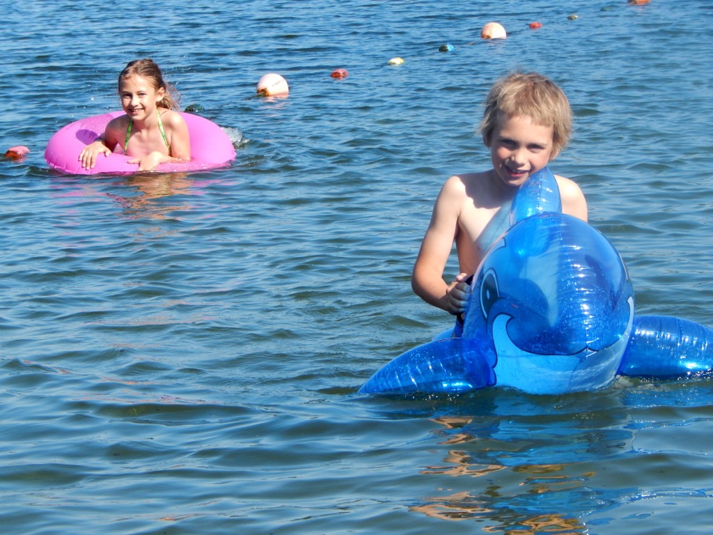 Na szczęście mamy blisko do jeziora. Wczoraj, po powrocie Igotaty z pracy, udaliśmy się tam całą rodzinką na piechotę. Ku radości Groszka i Iskierki wzięliśmy zabawki do nadmuchiwania: koła, słonia i rekina. Nad wodą było bardzo przyjemnie! Upał wreszcie przestał męczyć, a zaczął cieszyć.