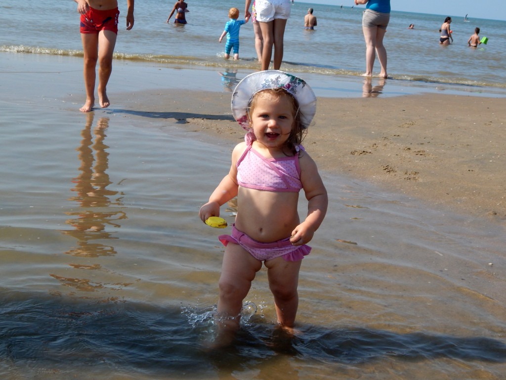 Znaleźliśmy miejsce blisko wody. Wykąpaliśmy się, jak zwykle, na raty. Och, jak przyjemnie było się schłodzić w morzu! Słona woda stawiała znacznie mniejszy opór, toteż pływało się lekko i łatwo. Jednak już przypadkowe posmakowanie wody z tak dużą zawartością soli, bądź dostanie się jej do oczu, nie było miłym doznaniem. Po wodnych szaleństwach Iskierka z Groszkiem zabrali się za budowanie z piasku i błota. Miałam nadzieję, że może zainspirują się wcześniej oglądanymi piaskowymi rzeźbami, ale dzieci głównie ograniczyły się do lepienia kul i tworzenia wałów. Oczywiście Okruszek równie ochoczo przystępował do psucia i burzenia…