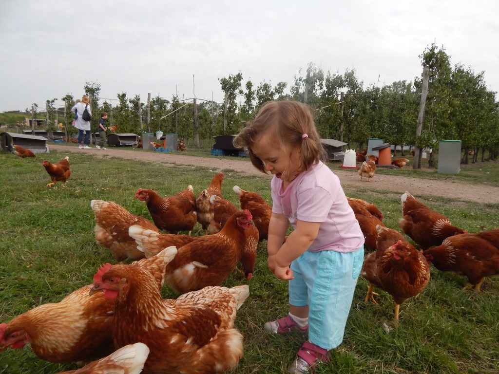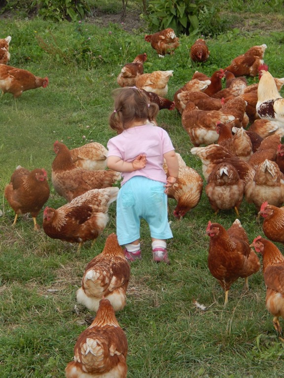 Za to starsza siostra bała się małych dziobków i próbowała się skryć przed kurami, ale było to trudne, gdyż ptaki panoszyły się w każdym miejscu. Iskierka nie miała wyjścia. Musiała okiełznać lęk oraz starać się nie podpaść tym pierzastym gospodyniom i po prostu zająć się swoją robotą, czyli zrywaniem owoców. Groszek z kolei trochę prowokował kury robieniem głupich min i dziwacznych gestów, ale gdy kwoki zaczęły głośno gdakać i pędzić za nim rozjuszoną gromadą, synek szybko zaprzestał tego typu praktyk. Stwierdził, że te kury są zupełnie pozbawione poczucia humoru…