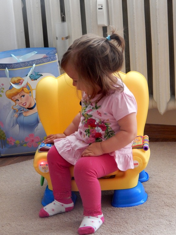Lubię się też bawić swoim nowym krzesełkiem, które dostałam od rodziców chrzestnych. Jeśli ktoś uważa, że krzesło służy wyłącznie do siedzenia, to jest w błędzie! Musiałby zobaczyć mnie w akcji! Powinnam dostać order pomysłowości, bo odkryłam wiele nowych zastosowań tego mebelka.