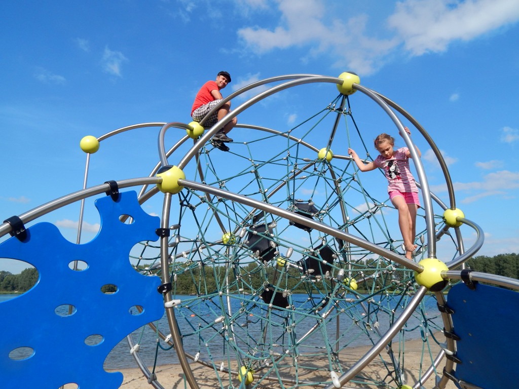 Może tylko na koniec zdradzę jeszcze jedną, maleńką przygodę. Ostatnio przyjechał do nas z Polski brat mamy, czyli wujek M. Pewnego popołudnia wybraliśmy się z wujkiem do pobliskiego parku. Tego, w którym są dwa jeziorka… Udało mi się zrobić mamie psikusa! A było tak. Wujek M., Iskierka i Groszek wspięli się na taki przyrząd zwany pająkiem, usytuowany przy brzegu jeziora. Mama prawie położyła się na ziemi, próbując im zrobić ładne zdjęcie.