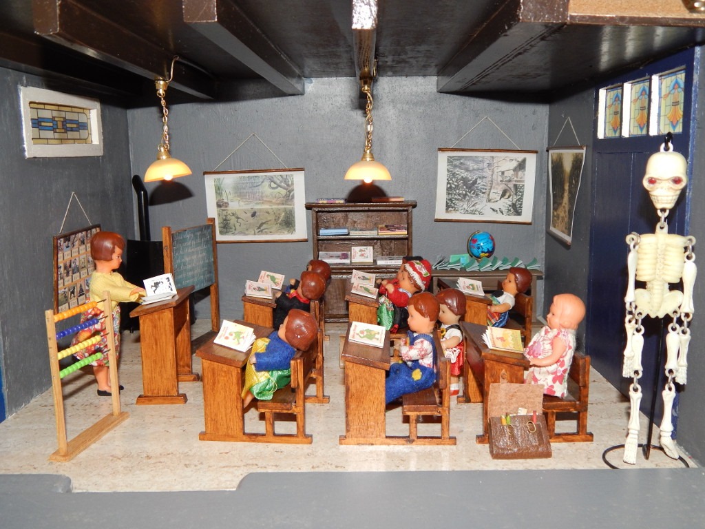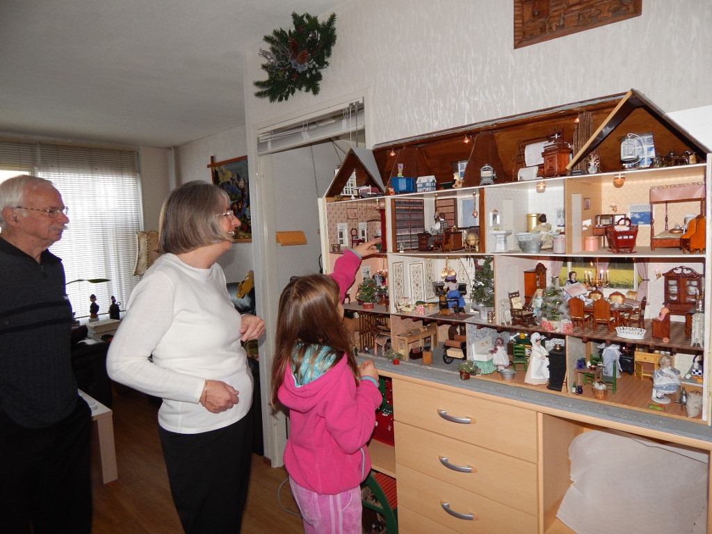 A w każdej izbie toczy się życie… Tata leży na kanapie i czyta gazetę. Mama, w fartuszku, stoi przy kuchence i miesza zupę w garnku. Babcia siedzi w fotelu bujanym i dzierga na drutach. A w pokoju dziecięcym bawią się dzieci. Dziewczynka karmi z miniaturowej butelki laleczkę, chłopiec pcha samochodzik, maluszek buduje wieżę z klocków. A w niemowlęcym pokoiku, w kołysce, słodko śpi niemowlę. Wszystkie pomieszczenia są gustownie umeblowane i zaopatrzone w rozmaite sprzęty domowe.