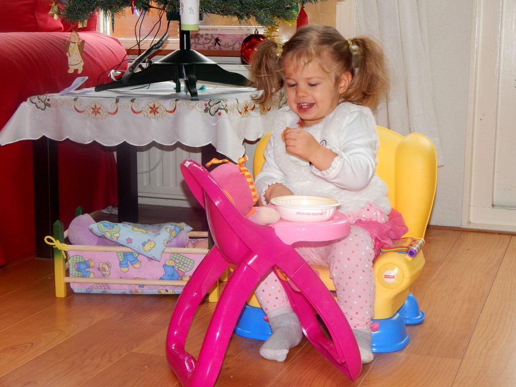 Pod choinką leżały prezenty! Wszystkie – tylko dla mnie! Na dodatek, nie żadne tam klocki, tylko w końcu to, o czym marzyłam – łóżeczko i krzesełko dla lali. Hura!