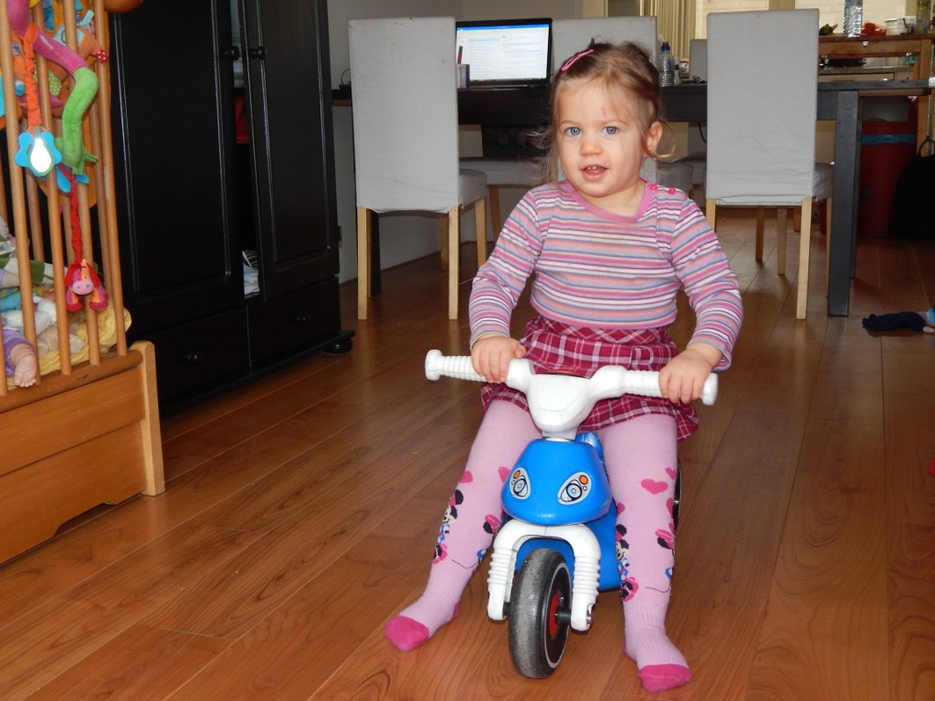 Najpierw, z pewną dozą nieśmiałości, wsiadłam na nowy pojazd, ale szybko ośmieliłam się i „połknęłam bakcyla”. Zrozumiałam, że aby się przemieszczać, muszę naprzemiennie odpychać się nogami od ziemi. Szybko zdobyłam tę umiejętność i wtedy sunęłam po pokoju niemal z prędkością światła.