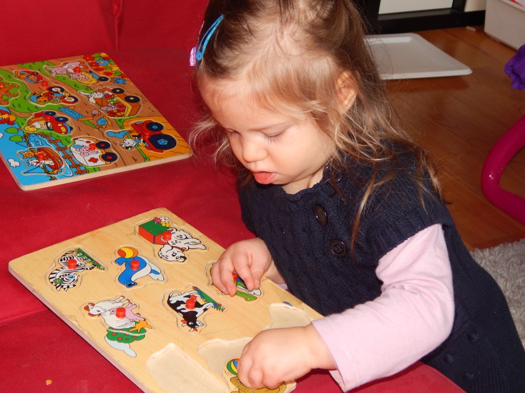 Umiem też układać płaskie drewniane układanki. Jeśli nie wiecie, co mam na myśli, to objaśniam. Wkładam różnokształtne zwierzątka we właściwe miejsca, czyli otwory o odpowiednich kształtach. Acha! To może by tak … małe brawa dla Okruszka?