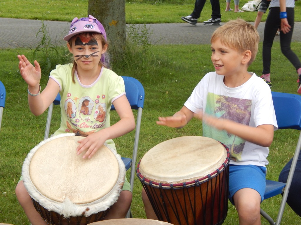 Starsze dzieciaki wybawiły się, pograły w badmintona, poskakały w nadmuchiwanych zamkach, a także powitały słońce rytmicznie uderzając w bęben.