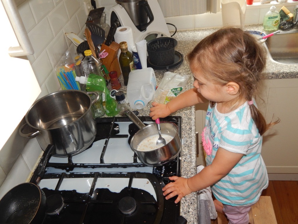 Owszem mam swoją własną zabawkową kuchenkę, jednak najbardziej pociąga mnie prawdziwa kuchnia mamy. Choć mamcia narzeka, że nasza domowa kuchnia jest stanowczo za mała i gdy gotuje to brakuje jej miejsca. Tata ma na ten temat swoją teorię, a ja udowadniam mamie, że nawet w małej kuchni można czynić kulinarne rewolucje.