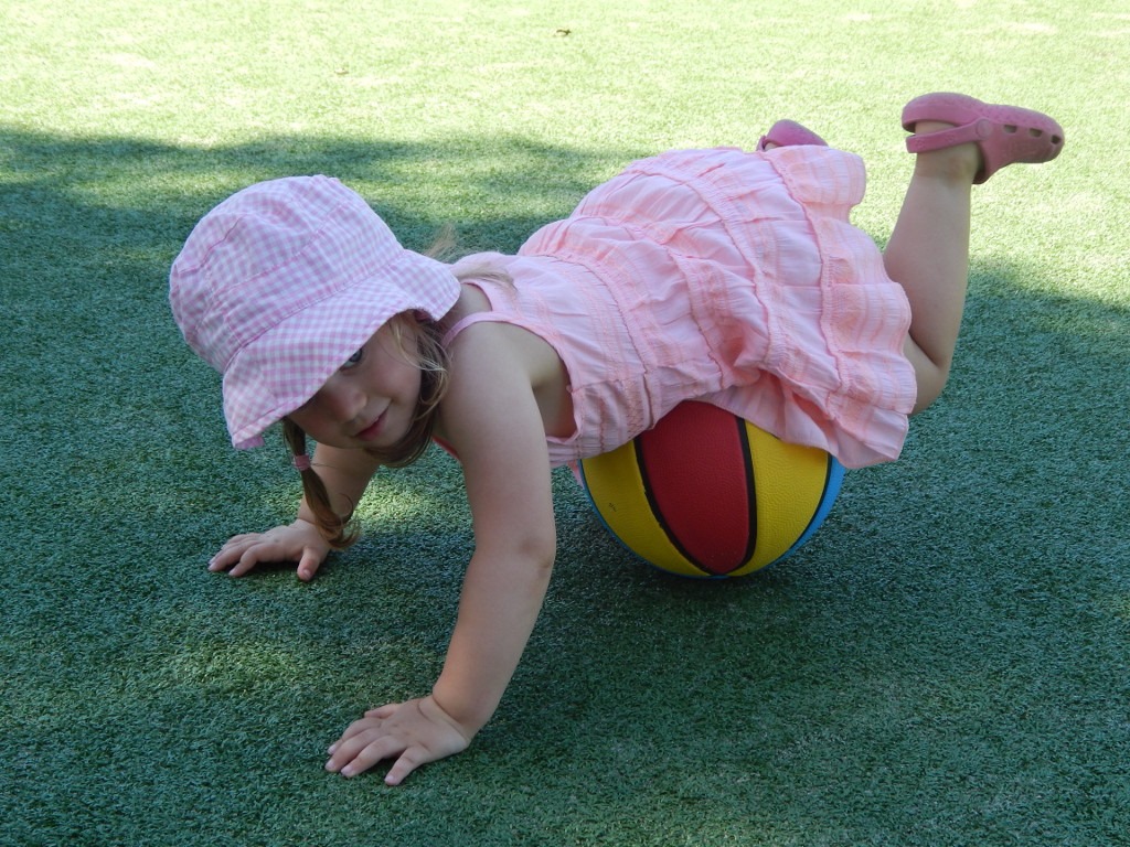 Zobaczcie, oto zwyczajna niewielka piłka. Można ją podrzucać, kopać, toczyć, to normalna sprawa. Ale ja umiem więcej: bez namysłu kładę się na piłce i kołyszę w przód i w tył, świetnie się bawiąc i przy okazji wzmacniając sobie obręcz barkową.