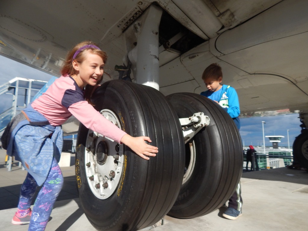 Na tarasie znajduje się samolot przystosowany do zwiedzania (ponadto połowa kadłuba jest też w galerii handlowej). Można śmiało wejść do środka, zająć miejsce w kabinie pilota (i dostać oczopląsu od niezliczonej ilości przycisków) bądź rozsiąść się w fotelu pasażera (i: albo pomarzyć o lataniu, albo próbować oswajać swój lęk przed maszyną). ![]()