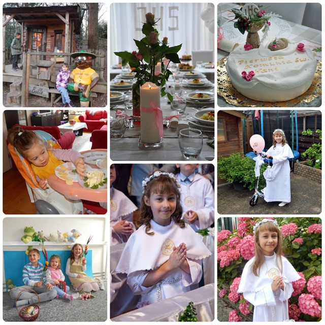 Braliśmy udział w dwóch uroczystościach Pierwszej Komunii Świętej – najpierw byliśmy gośćmi u naszego chrześniaka w Polsce, potem już w Holandii nasza najstarsza córka, Iskierką zwana, dostąpiła tegoż zaszczytu.