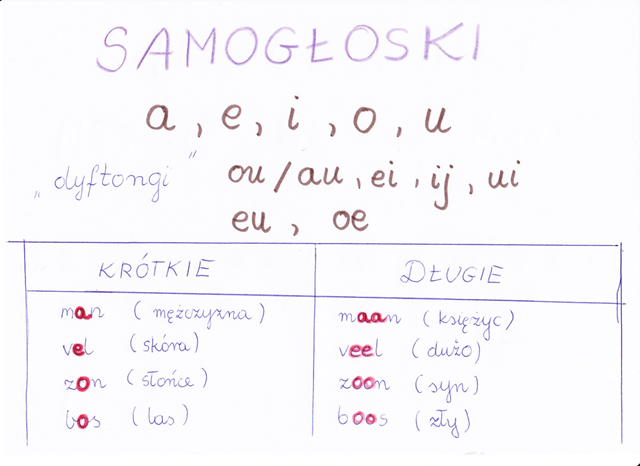 Pozornie jest to proste, ale – uwaga! – każda z tych samogłosek występuje w dwóch wariantach: może brzmieć krótko i długo. Spotyka się wiele słów różniących się od siebie jedynie długością brzmienia samogłosek, na przykład: wyraz „maan” oznacza księżyc, ale „man”- mężczyznę lub męża.