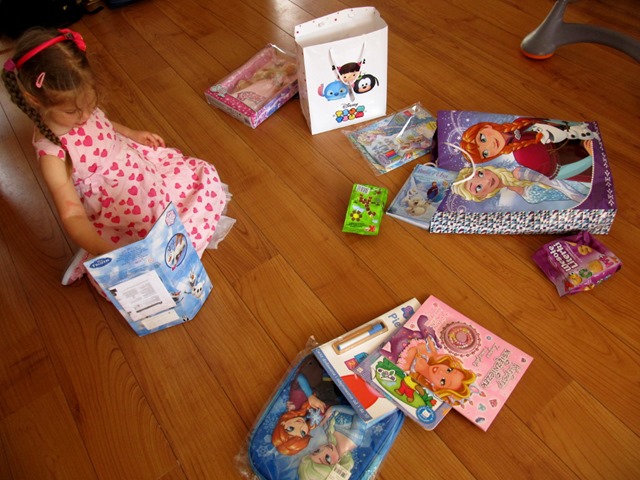 Wśród książeczek, naklejek, gazetek, garnuszków – znalazło się parę kandydatów na moich nowych ulubieńców: długowłosa Roszpunka, pluszowa Masza, Teletubiś Po no i bohater numer jeden, czyli Olaf (potrafiący ruszać głową i sunąć po podłodze jak po śniegu).