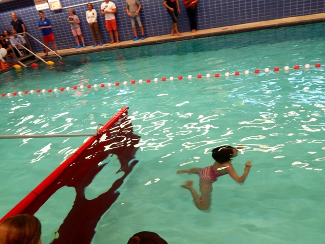 Po czym następował najtrudniejszy punkt programu (bynajmniej dla moich dzieci), czyli skok do wody „na główkę” i wyłowienie z dna basenu małego przedmiotu. Uwieńczeniem całości był kraul (12,5 m).