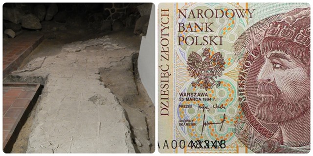 Tu po raz pierwszy przewodniczka sięga po portfel. Okazuje się, że banknot dziesięciozłotowy, który każdy z nas nie raz trzymał w dłoniach, zdobi rysunek przedstawiający mozaikę, która niegdyś pokrywała posadzkę gnieźnieńskiej świątyni. Jedyny zachowany fragment podziwiać można właśnie w podziemiach – jednak przyznać trzeba, że bez dozy wyobraźni się nie obędzie. Może oko eksperta wychwyci zdobienia od razu, dla mnie subtelne odcienie szarości zlewają się w jedną, bezbarwną plamę. Cóż, mężczyźni z rozróżniania kolorów nie słyną, wyjątkiem od tej reguły nie jestem, to pewnie dlatego. Winking smile