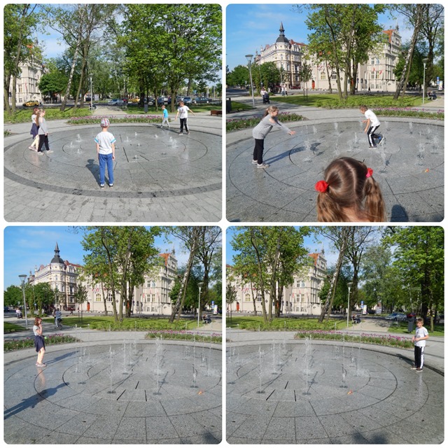 Później już tylko beztroska zabawa na placu zabaw, poprzedzona nieco nierozsądnym (ale za to jakże zabawnym!) igraniem z fontanną. Rodzicom przed oczami rysuje się obraz przemoczonych ciuchów, przeziębienia w najlepszym wypadku, zapalenia płuc w najgorszym. Dla dzieci to tylko powód do śmiechu, ekscytacja, chwila ulotnego szaleństwa, którego w dzieciństwie wszak nie powinno zabraknąć (bo jak nie teraz, to kiedy…?) Ostatecznie rodzice z ciężkim westchnieniem wyczekują najgorszego, pociechy zaś kuszą los, oj kuszą… Los pozostaje niewzruszony, widać na innych igrających z nim w tym czasie spoglądał surowo. Czyim pomysłem było to szaleństwo wspaniałomyślnie przemilczymy…