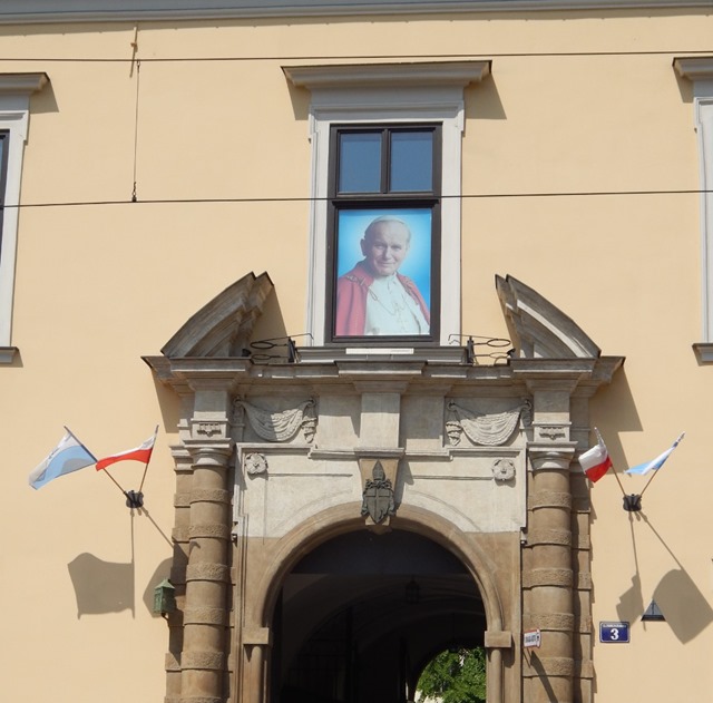 Po świątyni przychodzi czas na Sukiennice. Mnogość pamiątek nieco nas przytłacza, a Okruszek zaczyna budować długą listę zakupów. A to matrioszki, które wręcz domagają się, by zabrać je ze sobą. A to stroje (głównie sukienki, rzecz jasna), które błagają, by im pozwolić spowić Jej Okruszkowatość. A to rozkoszne pluszaki, wzorowane na niegroźną wersję wawelskiego smoka, którym Kraków znudził się już i pragną ruszyć w dalszą przygodę z nowopoznaną Przyjaciółką. Groszek również wpada w zakupowy szał: w planach ma prezentację w holenderskiej szkole dotyczącą Ziemi Ojczystej. Już w Gnieźnie zaopatrzył się w kilka pamiątek, w Krakowie jednak planował kolekcję wzbogacić przynajmniej o dwie rzeczy: koszulkę i szalik. Względnie czapkę. Ostatecznie dziatwa daje się przekonać, że Sukiennice nie zające… Dają się udobruchać obietnicą powrotu przed zamknięciem sklepów i możemy wreszcie ruszyć w stronę postaci, którą starsze rodzeństwo postawiło ponad krasnoludki. Po drodze jeszcze lekcja historii wciąż żywej w naszych sercach – przechodzimy w pobliżu okna papieskiego. Nasze dzieci urodziły się już po śmierci Jana Pawła II, mamy więc rzadką okazję wspomnieć im o człowieku, który odcisnął trwały ślad na życiu ich rodziców.
