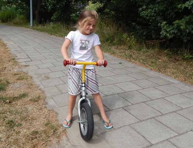 Księżniczka jest zadowolona. Dumna jak paw wkłada klapki i wsiada na rowerek biegowy.