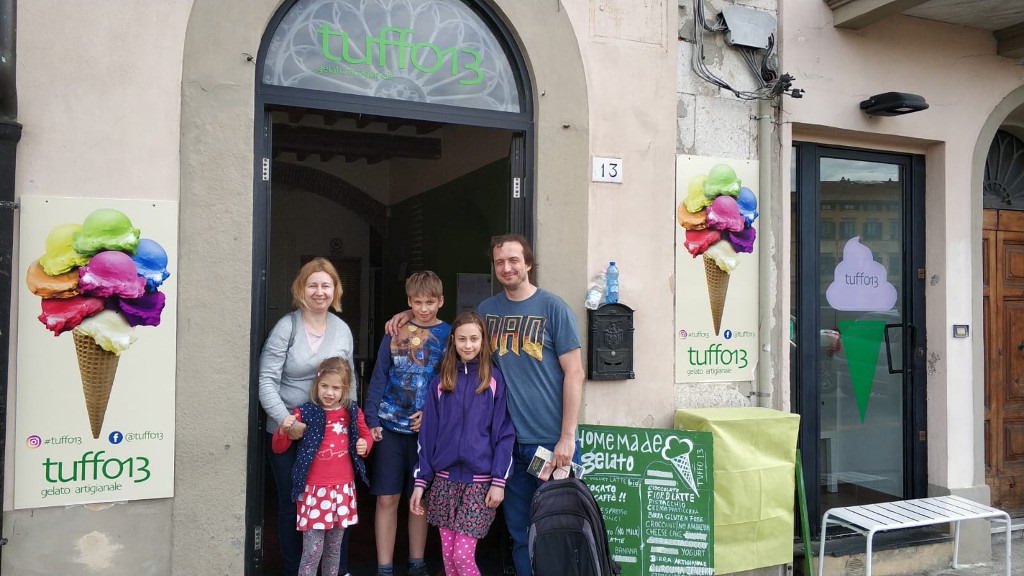 Po tej wizycie zaczęliśmy powoli kierować się w stronę parkingu, starając się trasę poprowadzić tak, by coś ciekawego po drodze zobaczyć. Zamiast jednak architektonicznych perełek, trafiliśmy na perełkę kulinarną. Niespodziewanie zatrzymał nas sympatyczny Włoch i zaczął dopytywać, czy nie jesteśmy przypadkiem z Polski. Jak się okazało – lokal, który prowadził, znany jest wśród naszych rodaków a na ścianie za główną ladą wypisano w naszym ojczystym języku „najlepsze lody w Pizie”.