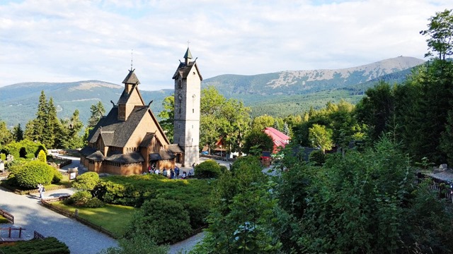 Tym bardziej wolały uciec w góry zamiast spacerować po mieście trzęsącym się od decybeli. Wyruszyły rankiem – nie skoro świt, lecz po śniadaniu, a nawet po pośniadaniowej kawie. Przy wtórze ryczących harleyjów udały się w kierunku świątyni Wang. Skandynawski kościółek, otoczony niewielkim cmentarzem (na którym notabene spoczywa Tadeusz Różewicz) stanowi miejsce tak malownicze, że słowa same chcą się tam układać w rymy. Jednak Jubilatka, trzy przyjaciółki i jedna bratowa nie miały czasu na poezję.