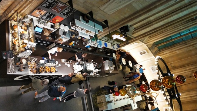 Widzę biały krzyż – stół, przy którym na wygodnych krzesłach odpoczywają czytelnicy i zwiedzający. Jedzą ciasto, piją czarną kawę z ekspresu albo białe cappuccino z pianką okrągłą jak hostia. Ja też tak chcę…