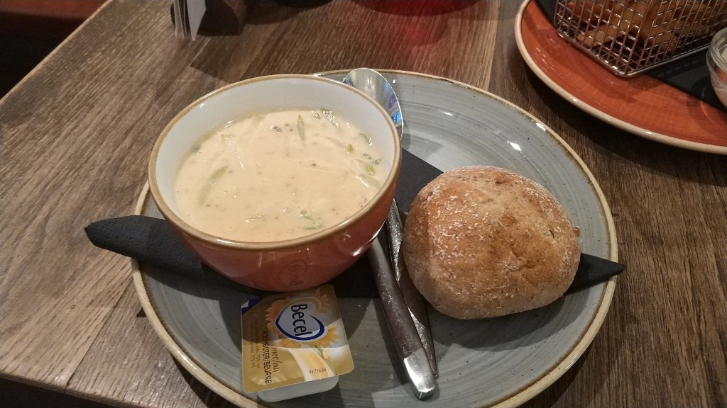Zwiedzanie kościoła – księgarni zaczęliśmy od przywitania: skrócony spacer po parterze zwieńczony wizytą w miejscu dawnego ołtarza, w którym obecnie znajduje się niewielka restauracja. Trafiliśmy tam w porę: kuchnia zamyka swe podwoje przed szóstą, więc jeśli chcemy zjeść coś „konkretnego” to niezależnie od godzin otwarcia księgarni musimy wyrobić się przed tym czasem z naszym zamówieniem. Po miejscowej zupie dla Igorodziców i frytkach dla dziatwy ruszyliśmy między półki…