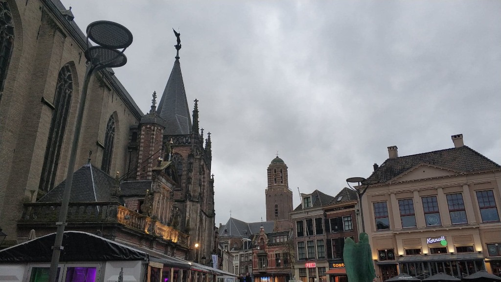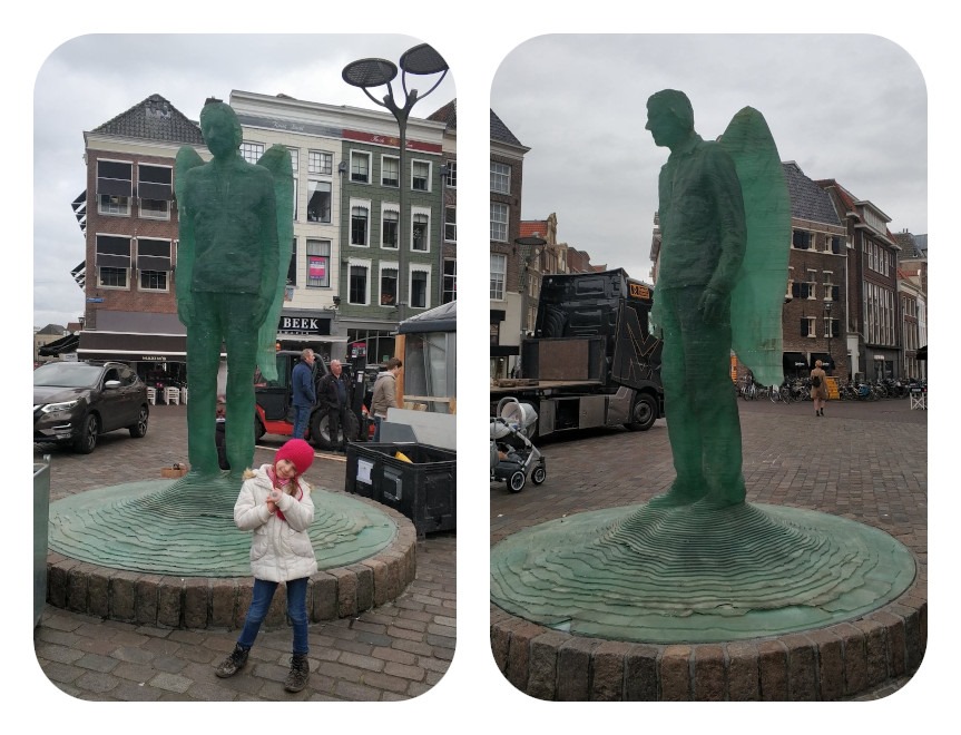 Księgarnia, do której koniecznie chcieliśmy zajść tego dnia otwarta była do późna, postanowiliśmy więc skorzystać z ostatnich, nieśmiało przebijających się przez warstwę chmur promieni słońca i najpierw pospacerować po malowniczej starówce w Zwolle. Spacer zaczęliśmy od obejścia Grote Kerk. Przed kościołem stoi interesująca, szklana figura Archanioła Michała, patrona miasta – zdecydowanie uwspółcześniona, jakby dowódca niebiańskich zastępów uznał współczesną modę za wygodniejszą od dawniejszych trendów.