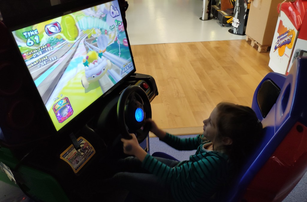 Na koniec: salon gier. Czego tu nie ma! Oryginalne maszyny przyciągają uwagę. Człek skacze od jednego, do drugiego. Nie ma tłoku, nie ma kolejek, nie ma kurczącego się w zatrważającym tempie worka monet. Automaty są ustawione w „free mode”. Można więc śmiało dać sobie utrzeć nosa i spróbować raz jeszcze, raz jeszcze, i jeszcze raz… Mamy więc przepiękny automat z Mario Kart, ze współczesną, cieszącą oczy grafiką na ekranie.