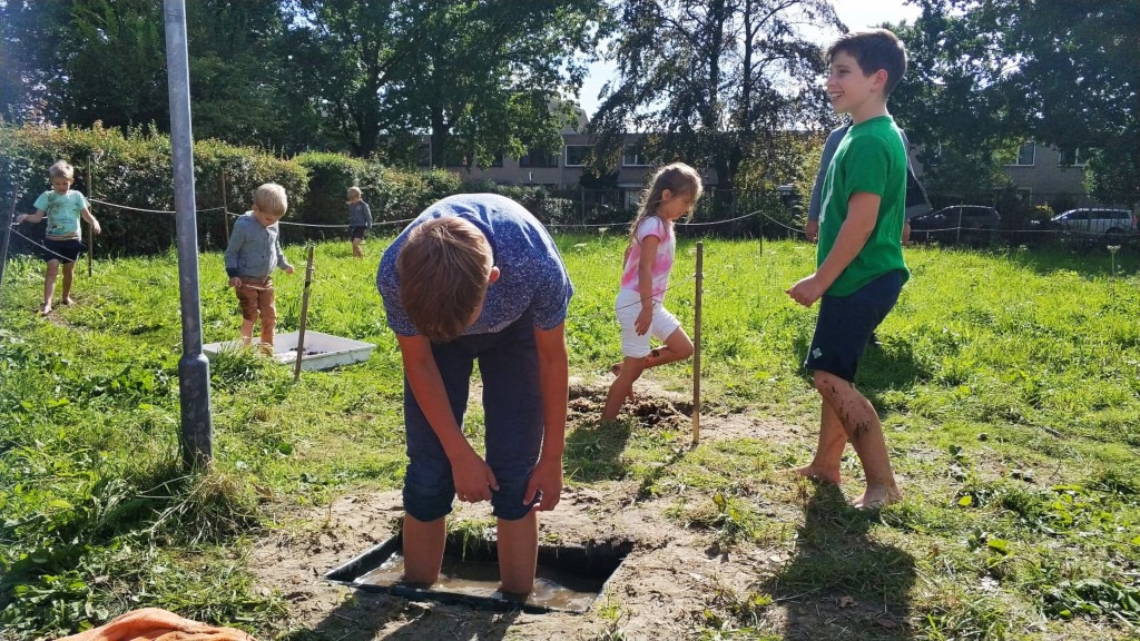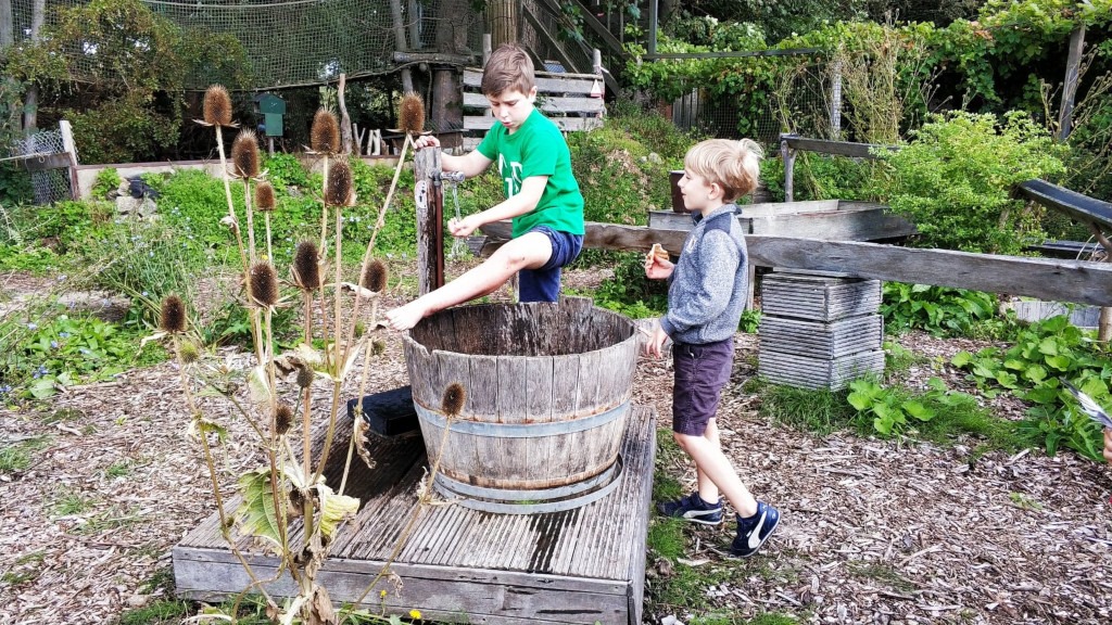 Z prostym wodnym placem zabaw – dzieci pompują wodę ze zbiornika zasilanego deszczówką i obserwują jak krąży w rynnach.