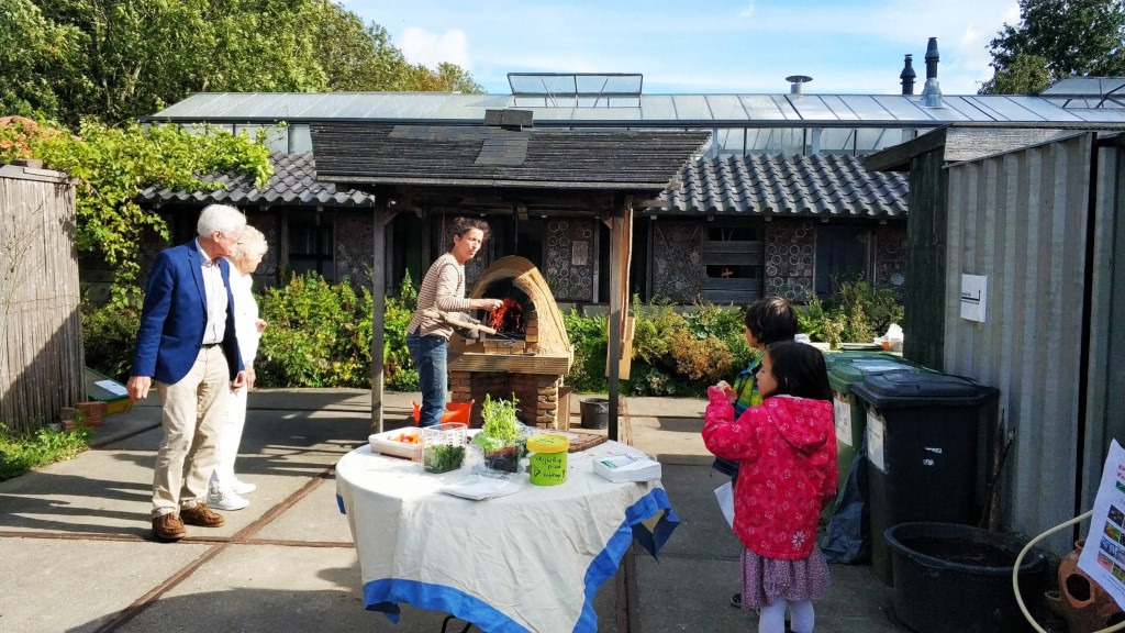 Poza kwiatami do jedzenia serwowano pizzę, pieczoną w piecu chlebowym (dla ścisłości: darmowej pizzy nie ma zawsze, ale ten weekend był jubileuszowy, dlatego była). Wolontariuszka systematycznie wkładała nowe partie do pieca, a po upieczeniu kroiła je na małe kwadraty i częstowała wszystkich chętnych.