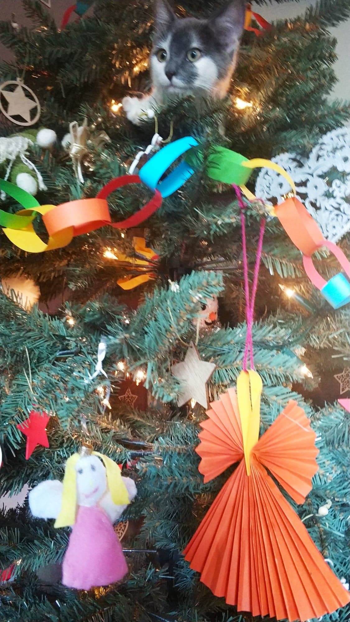 A co do wystroju choinki – u nas w tym roku tylko papierowe i słomiane ozdoby ze względu na kota. Bombki musiały zostać w pudełku. 😉