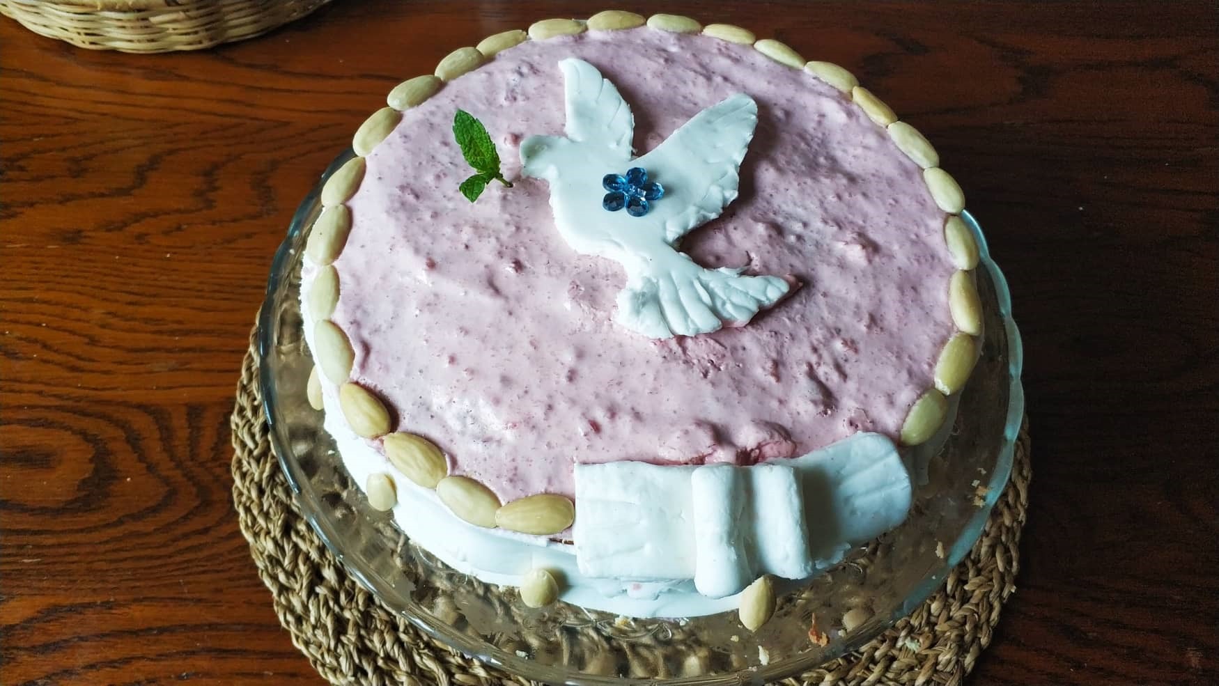 Miałam zamiar po prostu ułożyć na torcie kontur gołębicy z migdałów, ale w sklepie zobaczyłam opakowanie białej masy cukrowej. Nigdy tego nie kupowałam, ale że to była mała ilość (coś jak dwie dłonie) i tanie, więc stwierdziłam, że spróbuję.