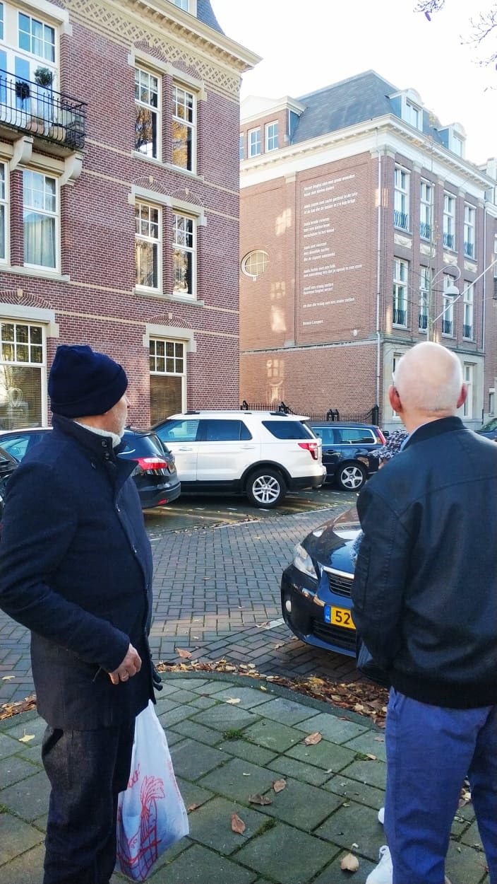 W drodze do ostatniego punktu wycieczki, minęliśmy budynek popularnego wydawnictwa literackiego „De bezige bij” (tł. pracowita pszczoła). Na bocznej ścianie kamienicy znajduje się fragment „wiersza oporu” Remco Camperta, ulubionego twórcy naszego nauczyciela.