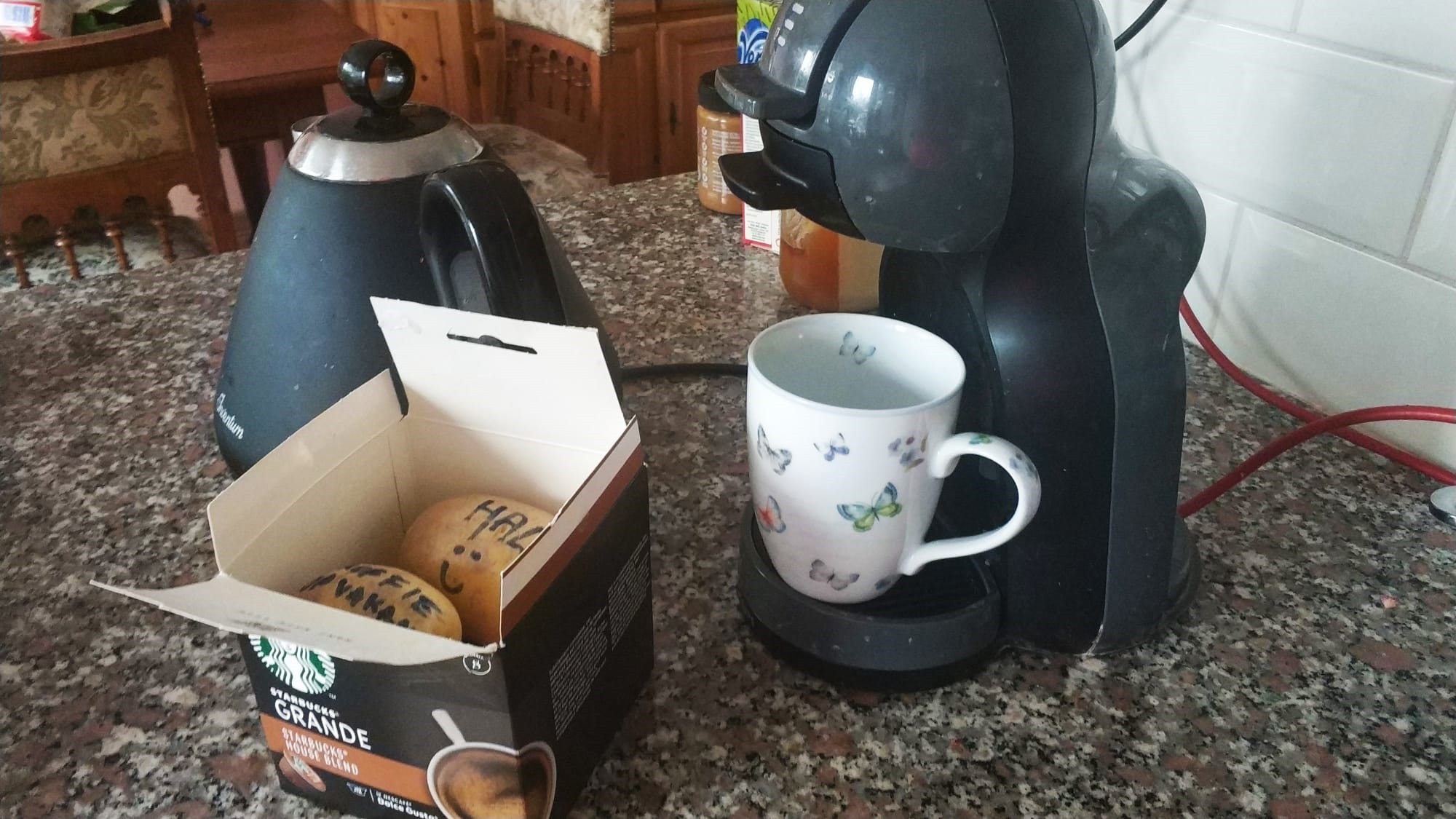 Tata Ralfiego jak przystało na rodowitego Holendra, uwielbia kawę, wypija kilka kubków dziennie. No więc mama opróżniła pudełko z kawą, a w miejsce kapsułek włożyła ziemniaki z napisem „Koffie op vakantie” (kawa na wakacjach).