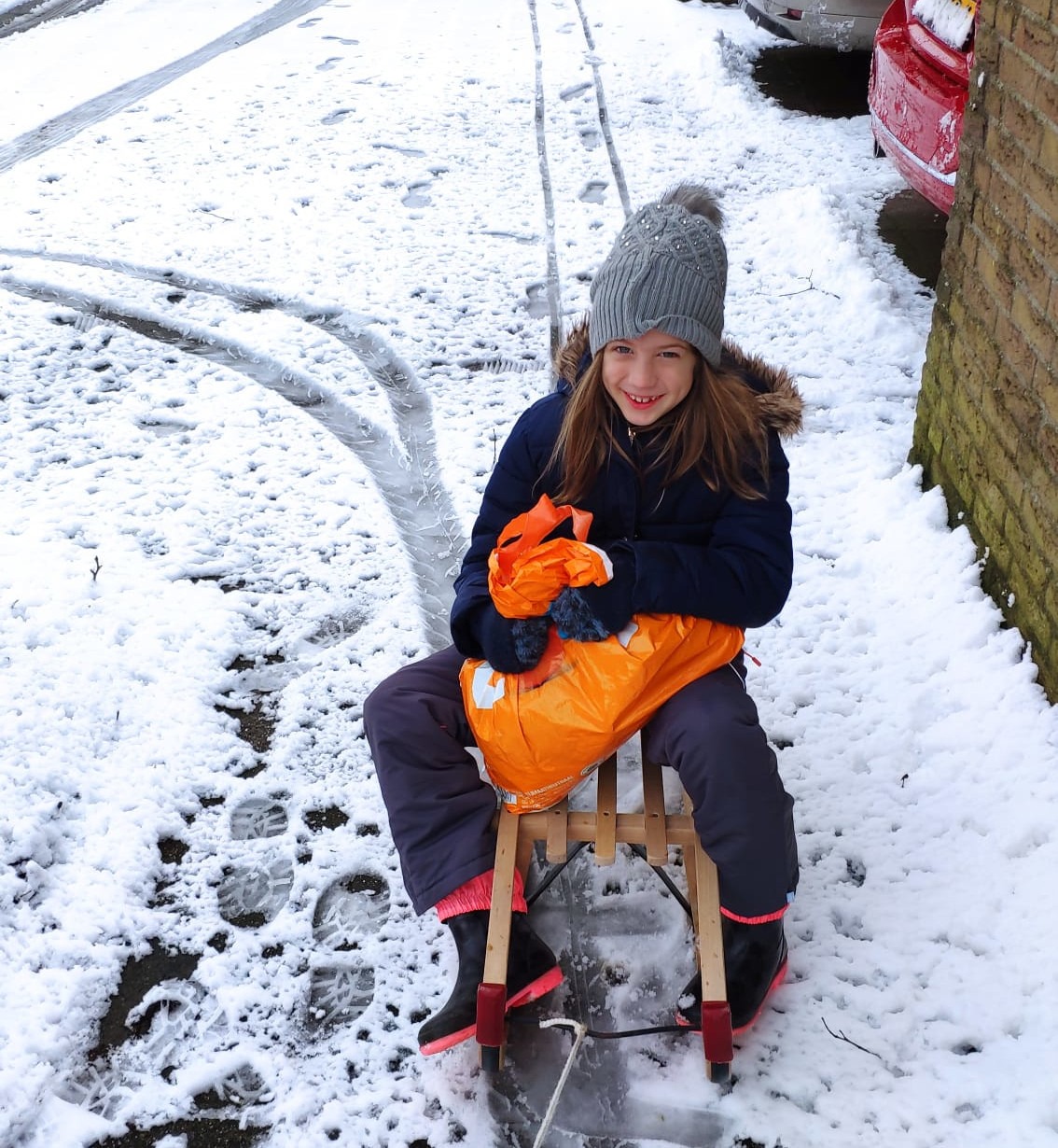 Oczywiście trzeba było wykorzystać okazję: pojechałam do szkoły na sankach!