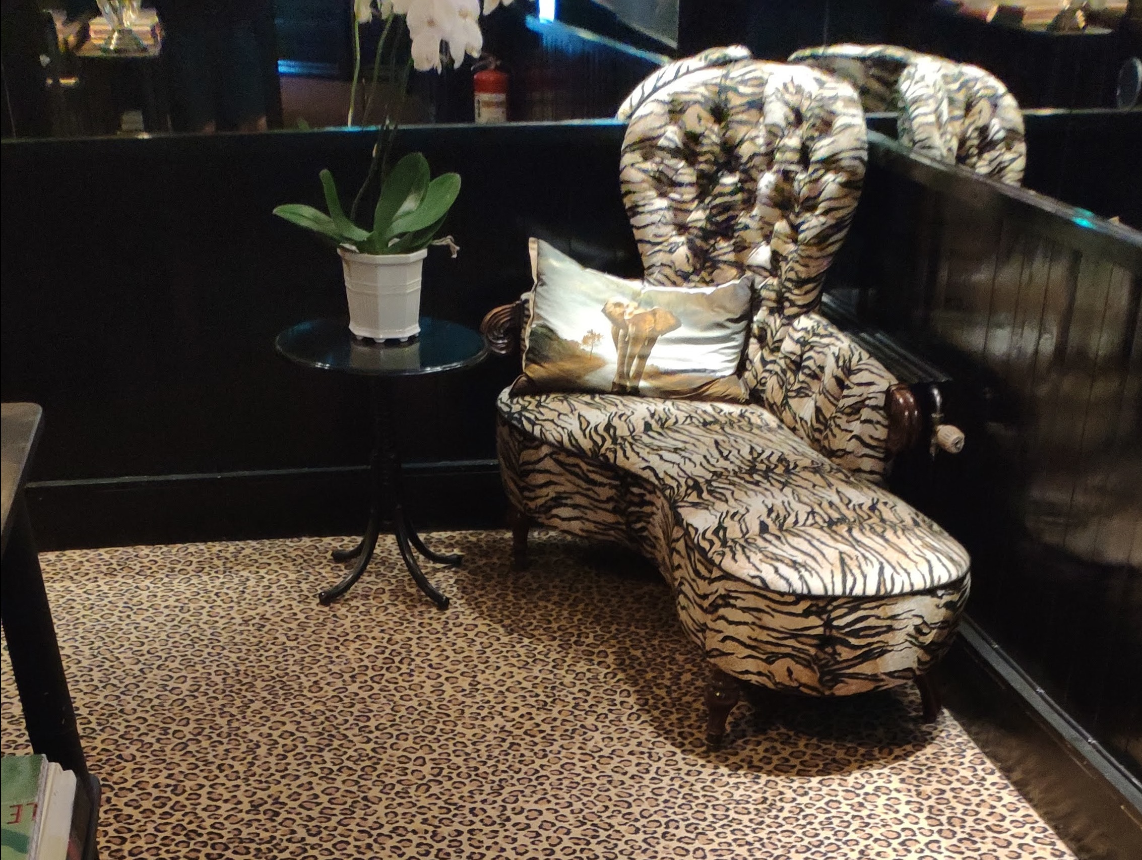 Obsługa również wpasowywała się w ten pasiasto-cętkowany klimat – panie z recepcji miały na sobie długie spódnice z lamparcim deseniem.
