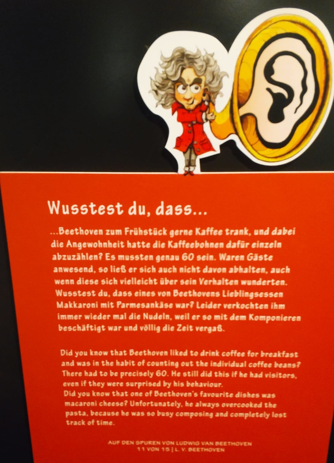 W moim odczuciu najbardziej poznałam Ludwika Beethovena, bo oprócz stałej ekspozycji, właśnie trwała wystawa, poświęcona utracie słuchu geniusza. Beethoven urodził się w Niemczech, ale mieszkał w Wiedniu przez 35 lat, przyjechał tu jako siedemnastolatek, by brać lekcje u Mozarta.