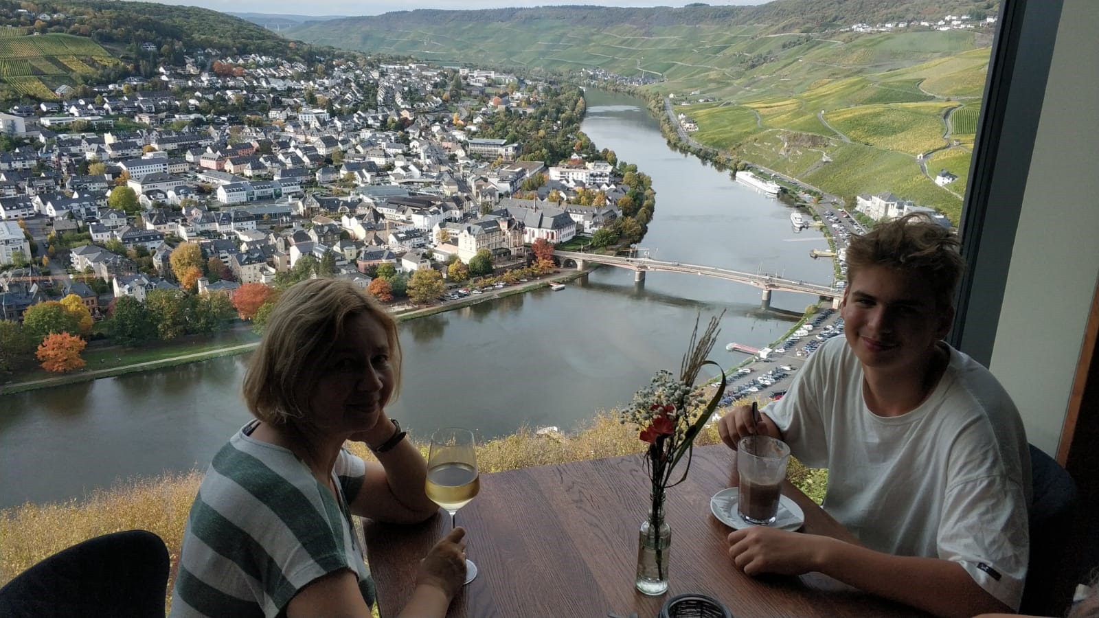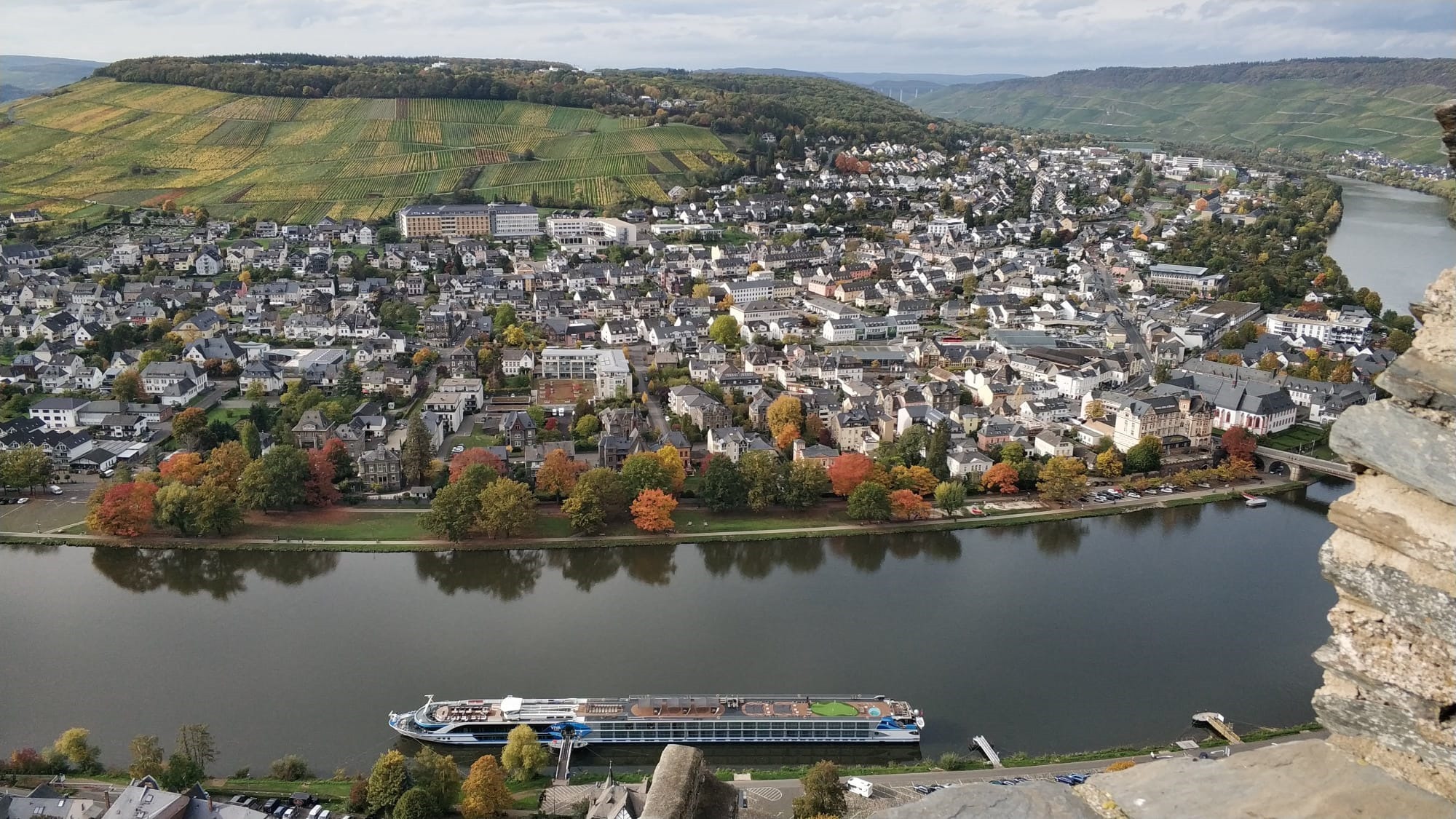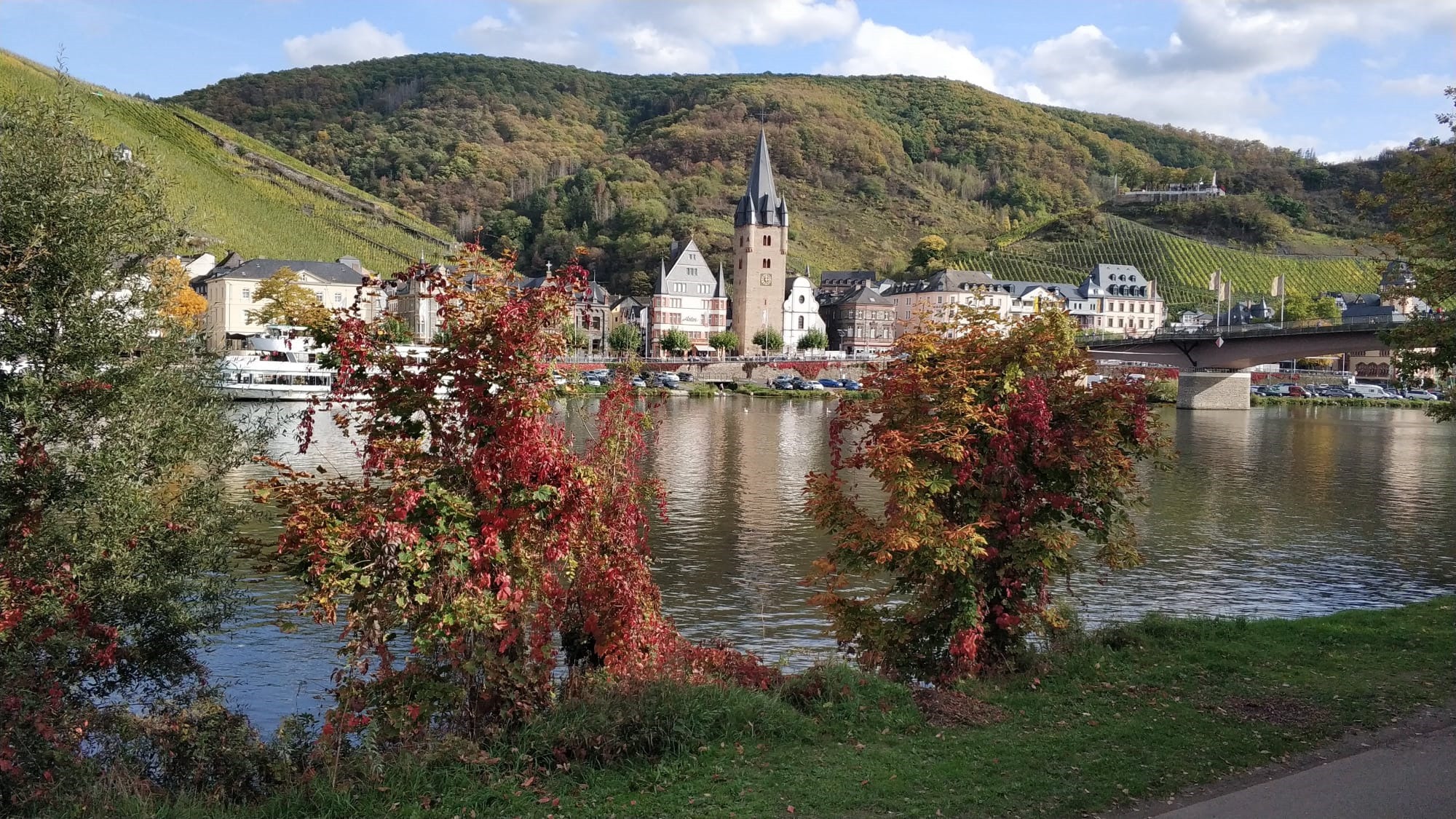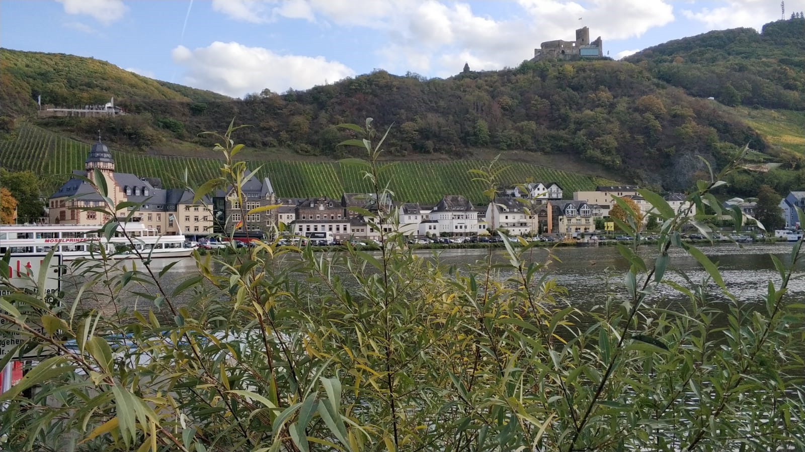 Wzgórza, winnice, drzewa i kamienice odbijają się w tafli wody, o tej porze roku (październik) wygląda to przepięknie. Jeśli przechadzamy się po stronie Kues, możemy podziwiać majestatyczny zamek Burgruine Landshut, widoczny na szczycie góry.