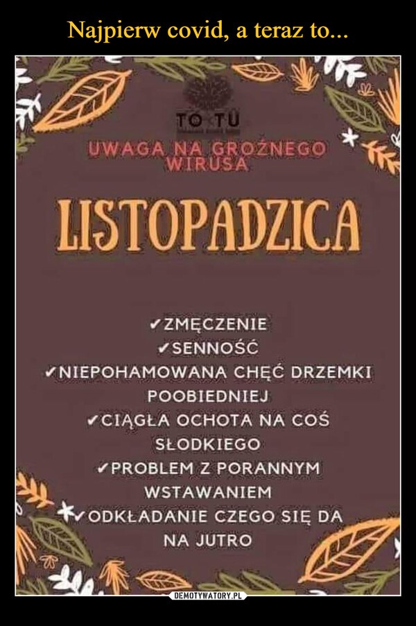 Listopadzica – zetknęłam się z tym określeniem na blogu Jotki i bardzo mi się spodobało. Bo o ile jesień złota i liściasta budzi powszechną sympatię (mniejszą czy większą), to gdy owo złoto rdzewieje, a liście butwieją w fałdach chodnika, sympatia znika. Jest nam zimno, chce się spać, czujemy zmęczenie, niepokój, pustkę i.. nie ma w tym nic wyjątkowego! – po prostu dopada nas listopadowy wirus.