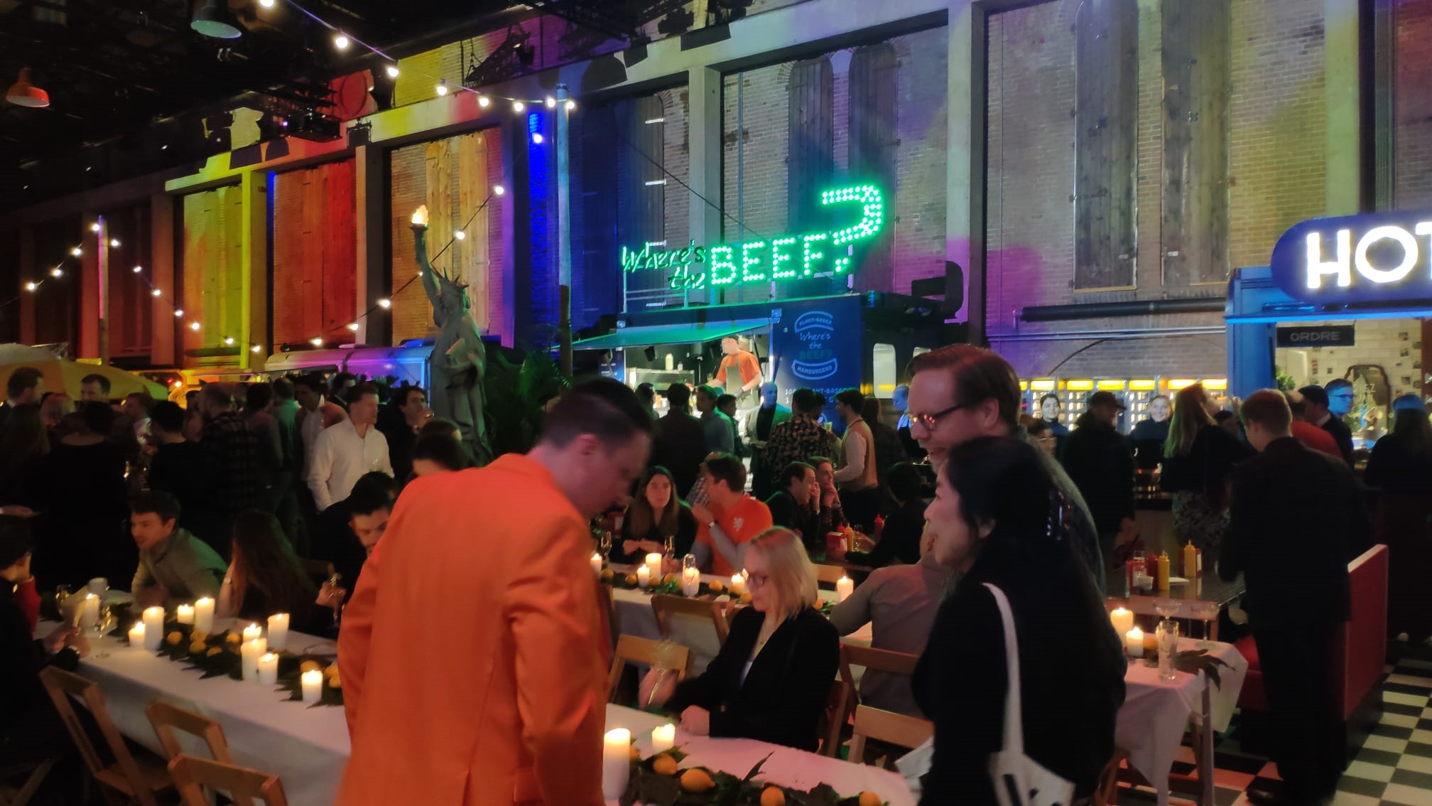 Dużo wina i okrągłe stoliki bez krzeseł, przy których można przystanąć i oprzeć łokcie. Przy ścianie rząd budek z jedzeniem w stylu: wege, chińskie, hot dogi, frytki, makarony, kanapki. Wszystko podane w taki sposób, by dało się zjeść na stojąco, drewnianymi sztućcami. Ale stoły i ławy też były, nikt jednak nie zagrzewał miejsca na dłużej.