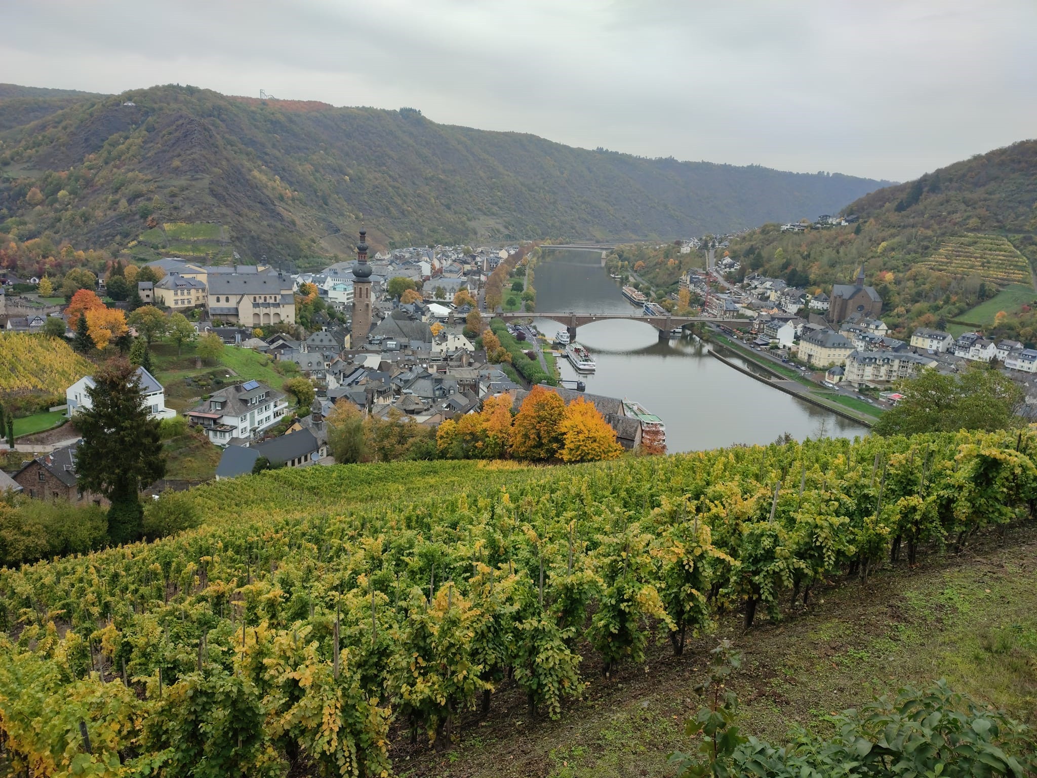 I tak, koło południa przybyliśmy do Cochem, kolejnej uroczej miejscowości, przytulonej do Mozeli. Jest to miasto powiatowe, niewielkie (5 tyś mieszkańców), z długą i burzliwą historią. Zasiedlone w czasach Celtów i Rzymian, sporo przeszło, bo i epidemię dżumy, i wojnę trzydziestoletnią, oblężenia, pożary, no a przede wszystkim liczne powodzie, na które jest narażone za sprawą położenia: nad rzeką i pośród wzgórz.