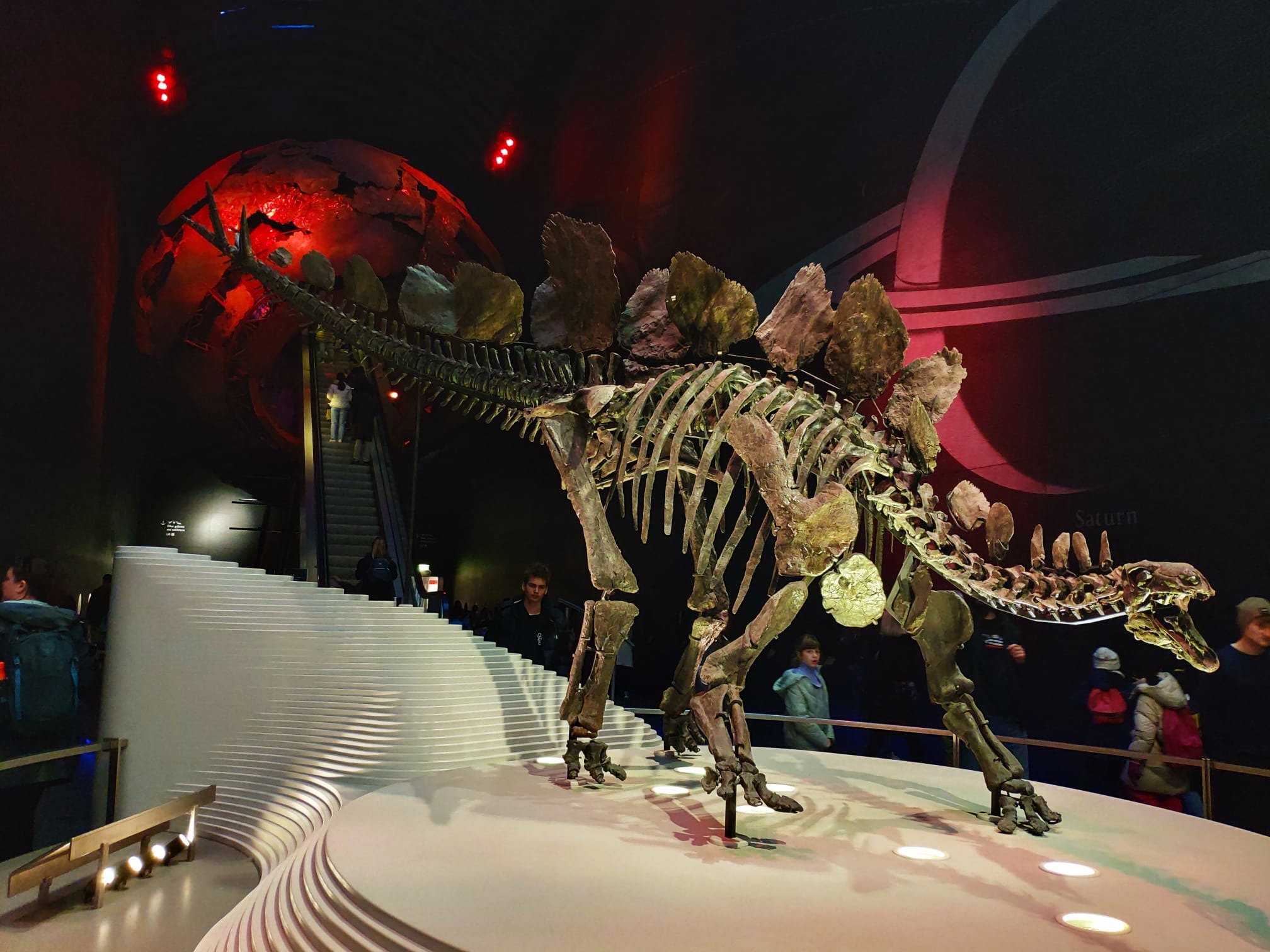 Od razu na dzień dobry stajemy na wprost wielkiego szkieletu dinozaura (trzy metry wysokości, sześć metrów szerokości). Jest to najbardziej nienaruszony skamieniały szkielet stegozaura, jaki dotąd znaleziono.