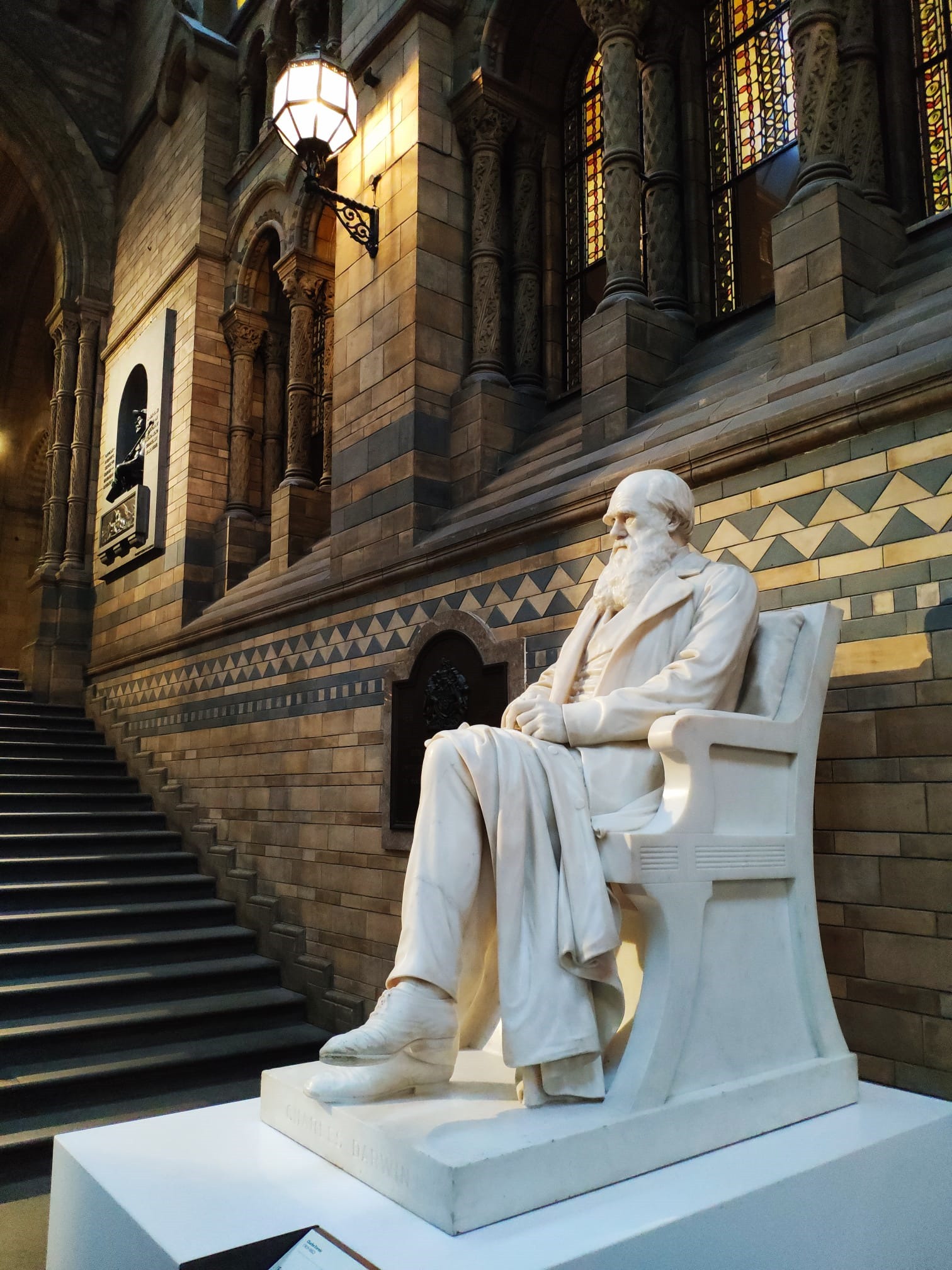 Jej autor, Karol Darwin na pomniku w głównym holu, obejmuje wzrokiem zwiedzających.