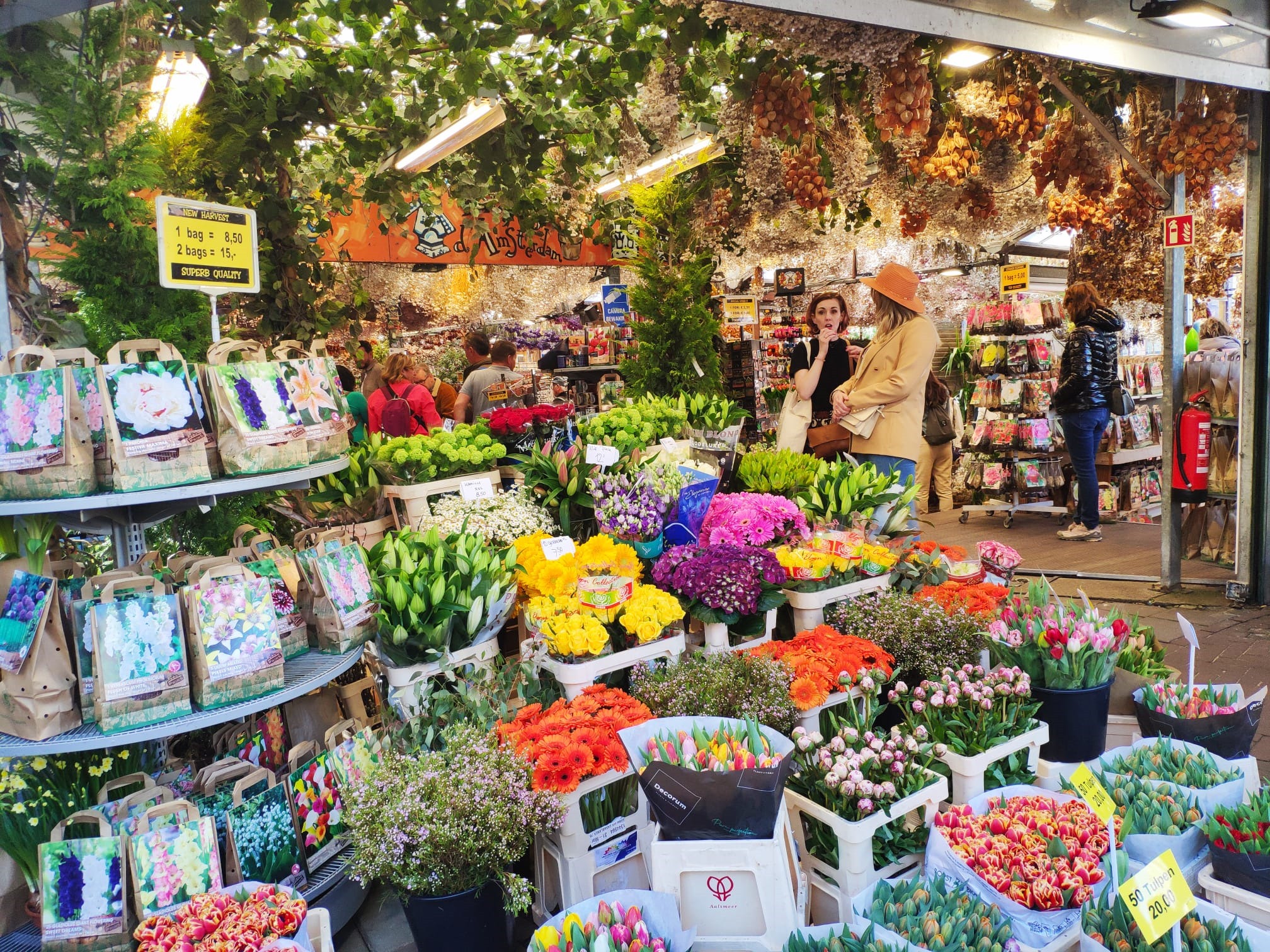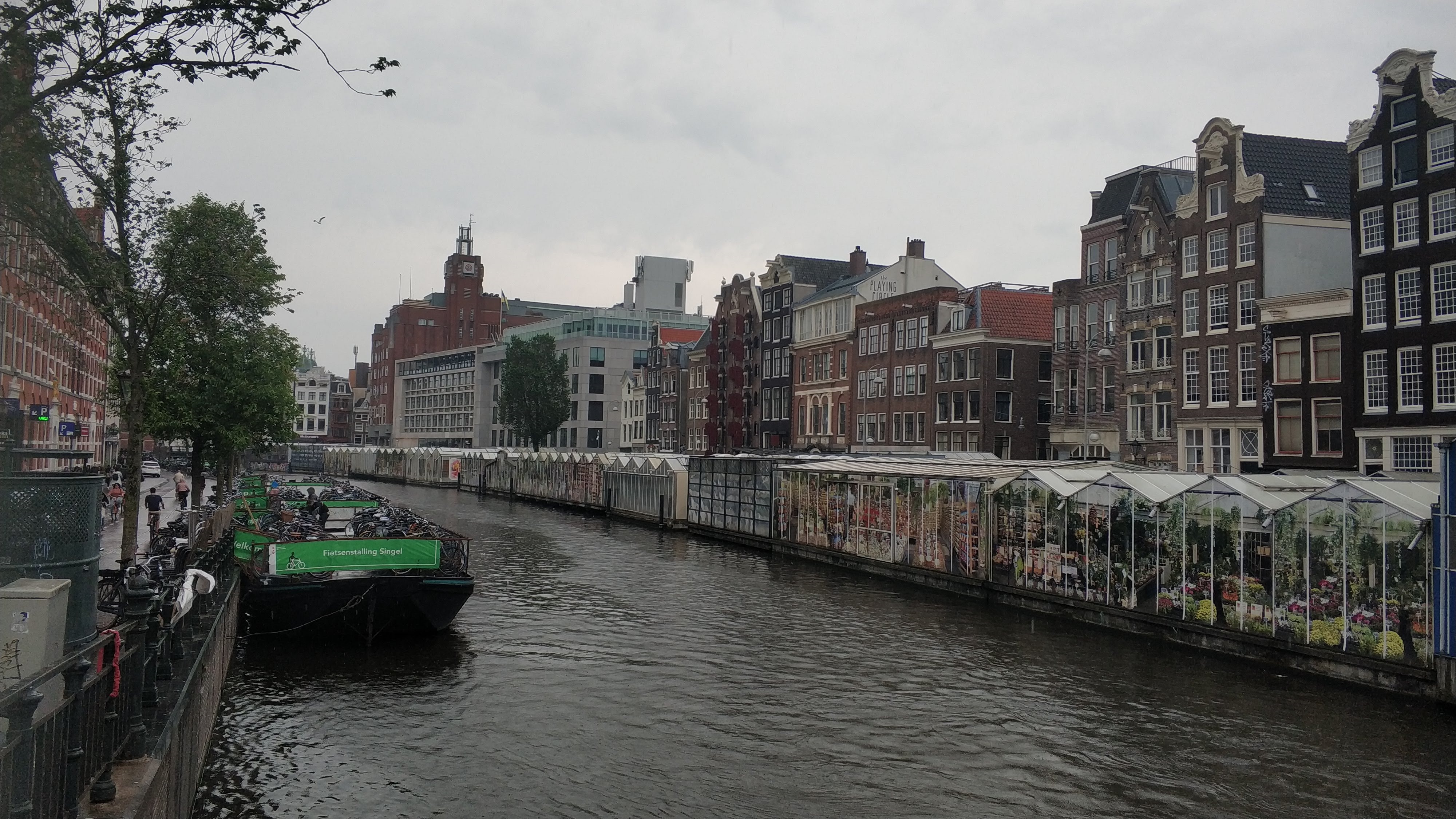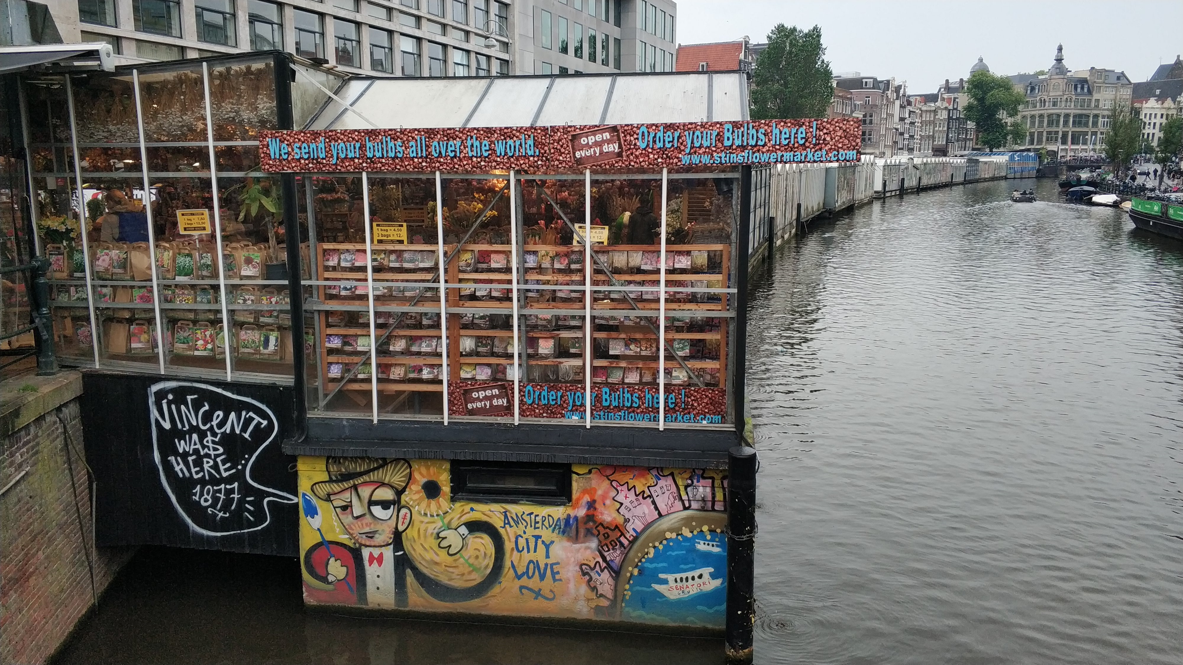Na kanale Singel minęliśmy targ kwiatowy bloemenmarkt, który istnieje już od 1862 r. Kiedyś hodowcy przywozili towar rzeką Amstel, dziś oszklonych budki z kwiatami są na stałe zamocowane na słupach w wodzie.