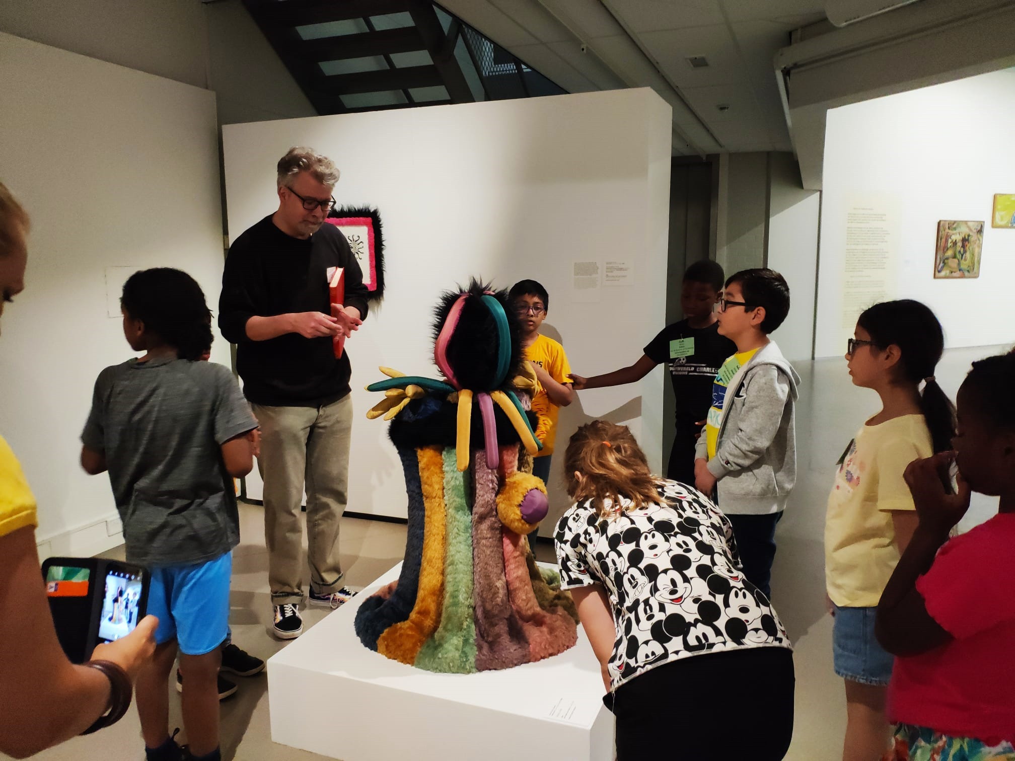 Udało się! Pan Marcel usadowił grupę przy wielkim płótnie z abstrakcyjną kompozycją nieregularnych brył – w kolorze czerwonym, żółtym, niebieskim i czarnym.