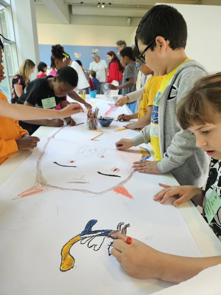 Zatem dzieci próbują. Pan Marcel zaprowadził naszą gromadkę do artystycznego atelier, gdzie już czekały kredki i rolka papieru.