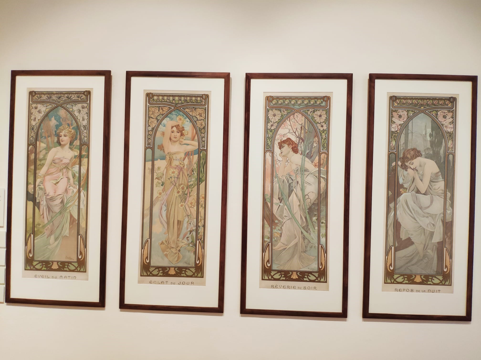 Znakiem rozpoznawczym Muchy są grafiki z pięknymi, nawet nieco wyidealizowanymi kobietami, z długimi włosami, wśród roślinnych ornamentów. Tworzył cykle plakatów np.: „Cztery pory dnia”, „Cztery pory roku” , „Cztery sztuki”.