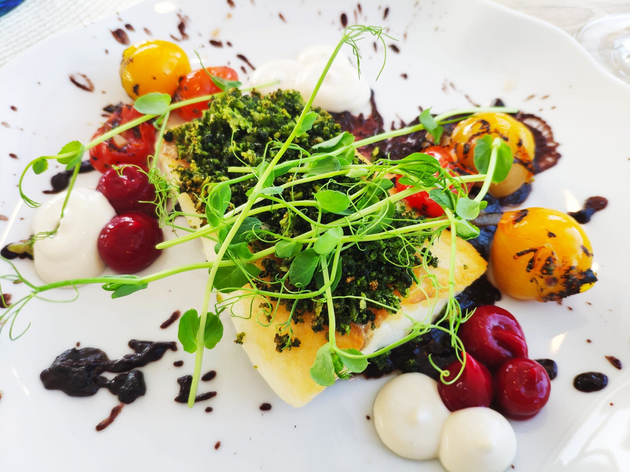 Okazało się, że serwują tu kuchnię molekularną, znaną z nietypowych połączeń smakowych i ciekawych faktur jedzenia. Zdecydowaliśmy się tylko na danie główne: rybę. Ale jakież ta ryba miała wyszukane towarzystwo: salsa limonkowa, kruszonka ziołowa, żel malinowy, puder sezamowy, pumeks z czarnego sezamu… Ho, ho.
